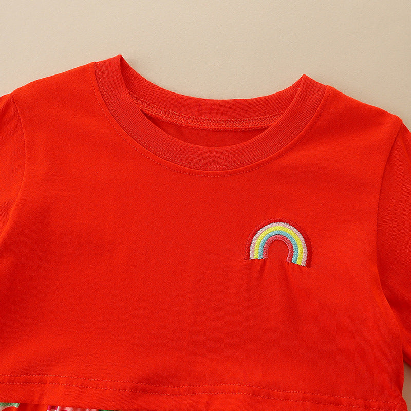 Introducing the Girls’ Red Floral Plaid Pattern Rainbow Logo Embroidery Patchwork, a delightful addition to any young girl's wardrobe. This charming outfit combines vibrant colors and playful patterns, making it perfect for both casual outings and special occasions. Crafted from high-quality cotton, it ensures comfort and breathability, allowing your little one to move freely and enjoy her day.