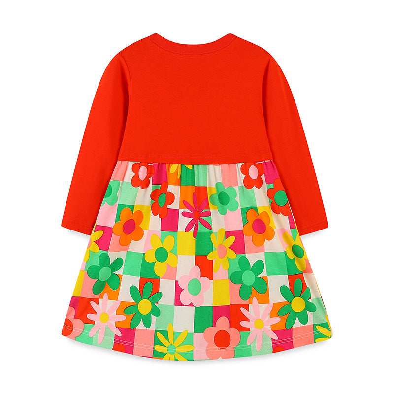 The Girls’ Red Floral Plaid Pattern Rainbow Logo Embroidery Patchwork is available in a range of sizes to fit girls aged 12 months to 8 years. The sizes include 90 (12-24M), 100 (2-3Y), 110 (3-5Y), 120 (5-7Y), and 130 (7-8Y). This ensures that you can find the perfect fit for your little one, allowing her to enjoy both comfort and style.
