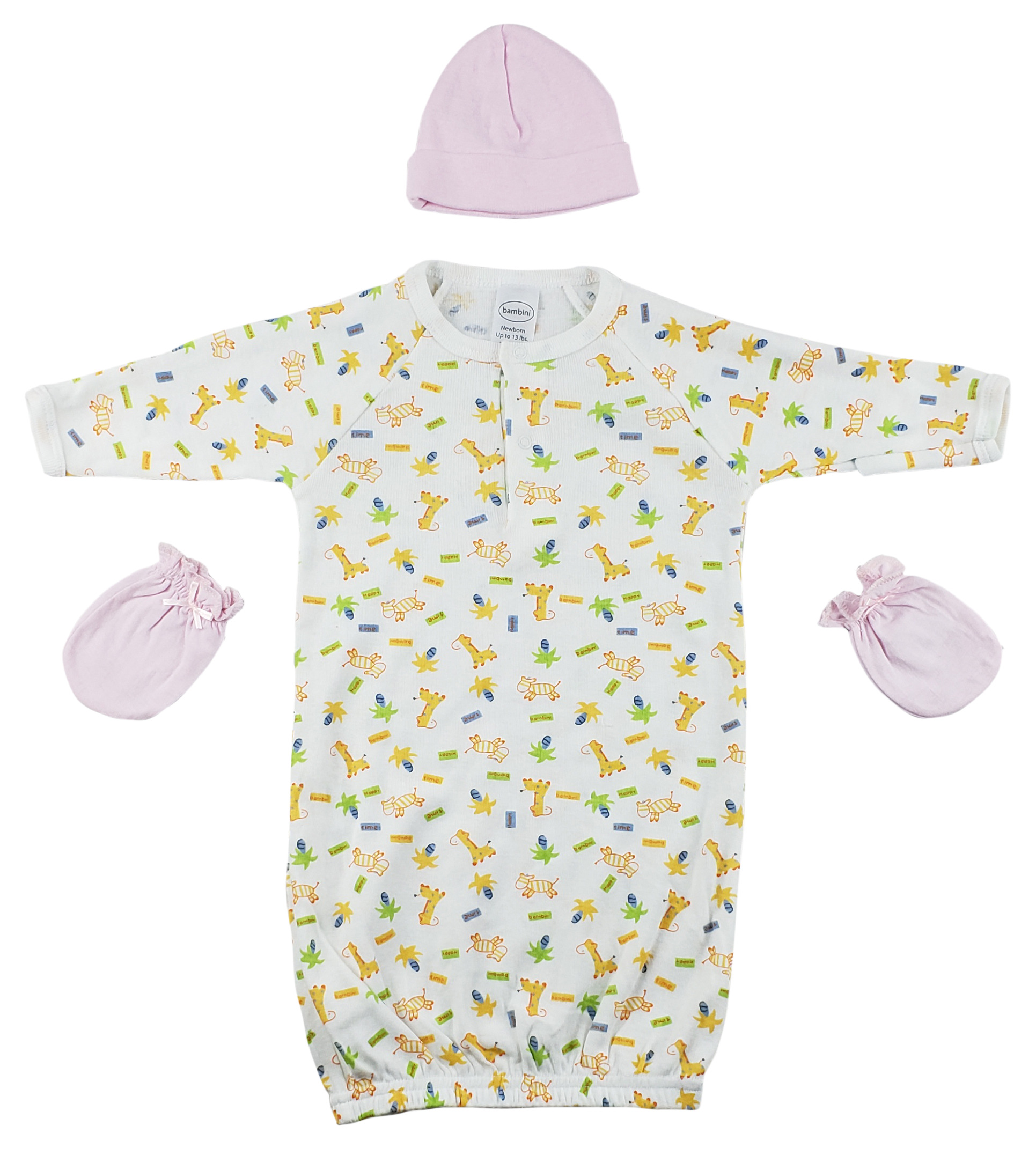 The Gown, Cap and Mittens - 3 Pc Set includes everything you need to keep your newborn cozy. The set features a unisex print gown made from 100% cotton, ensuring maximum comfort. The pink infant mittens are crafted from soft jersey material, providing warmth and protection for tiny hands. Additionally, the pink baby cap, also made from 100% cotton, completes the look while keeping your baby's head warm.