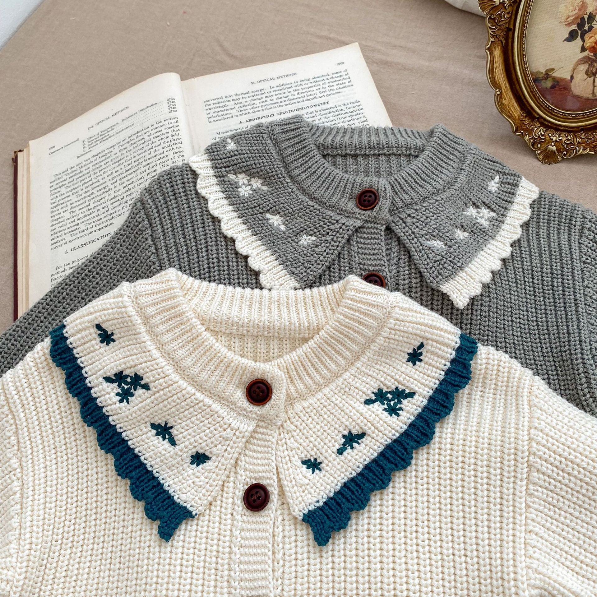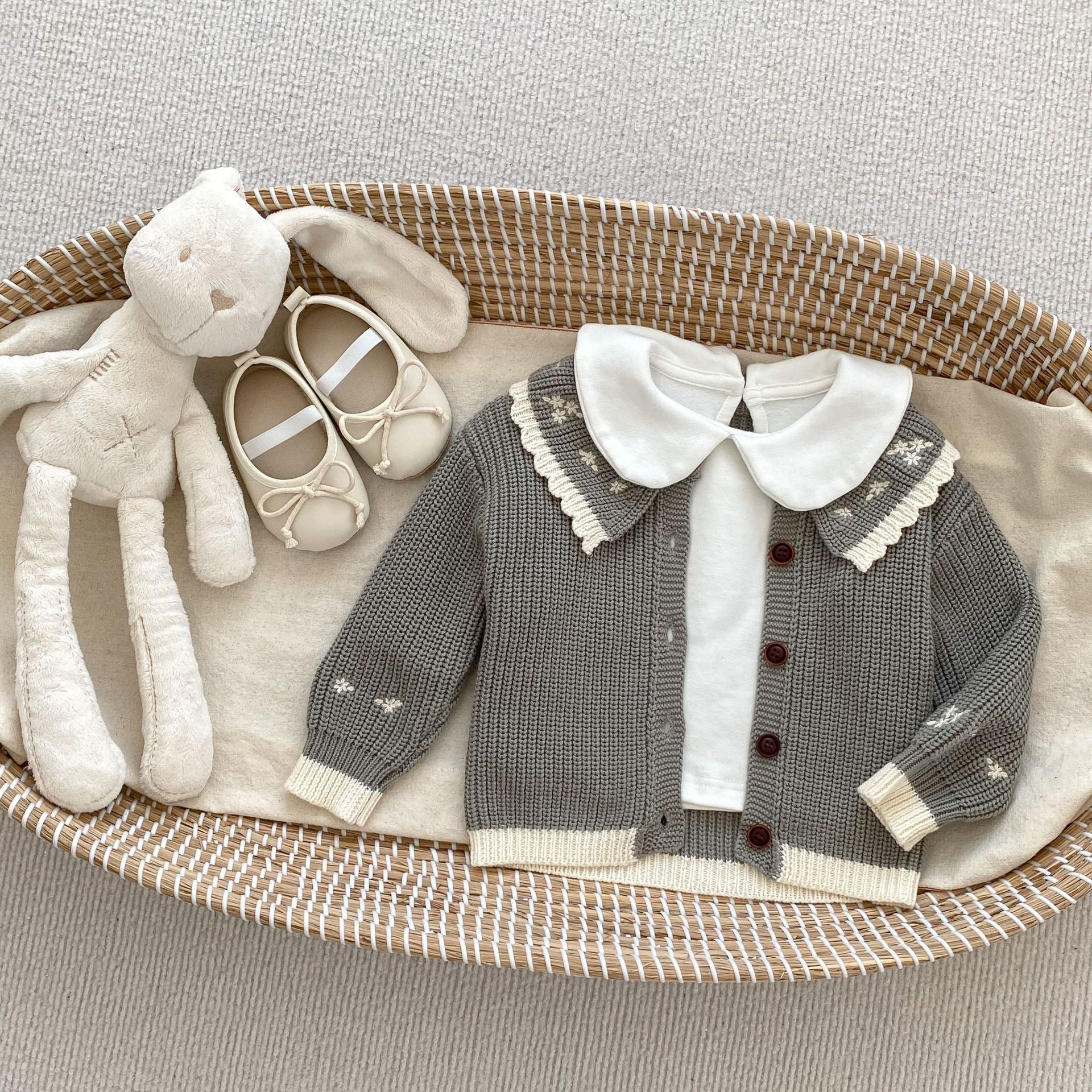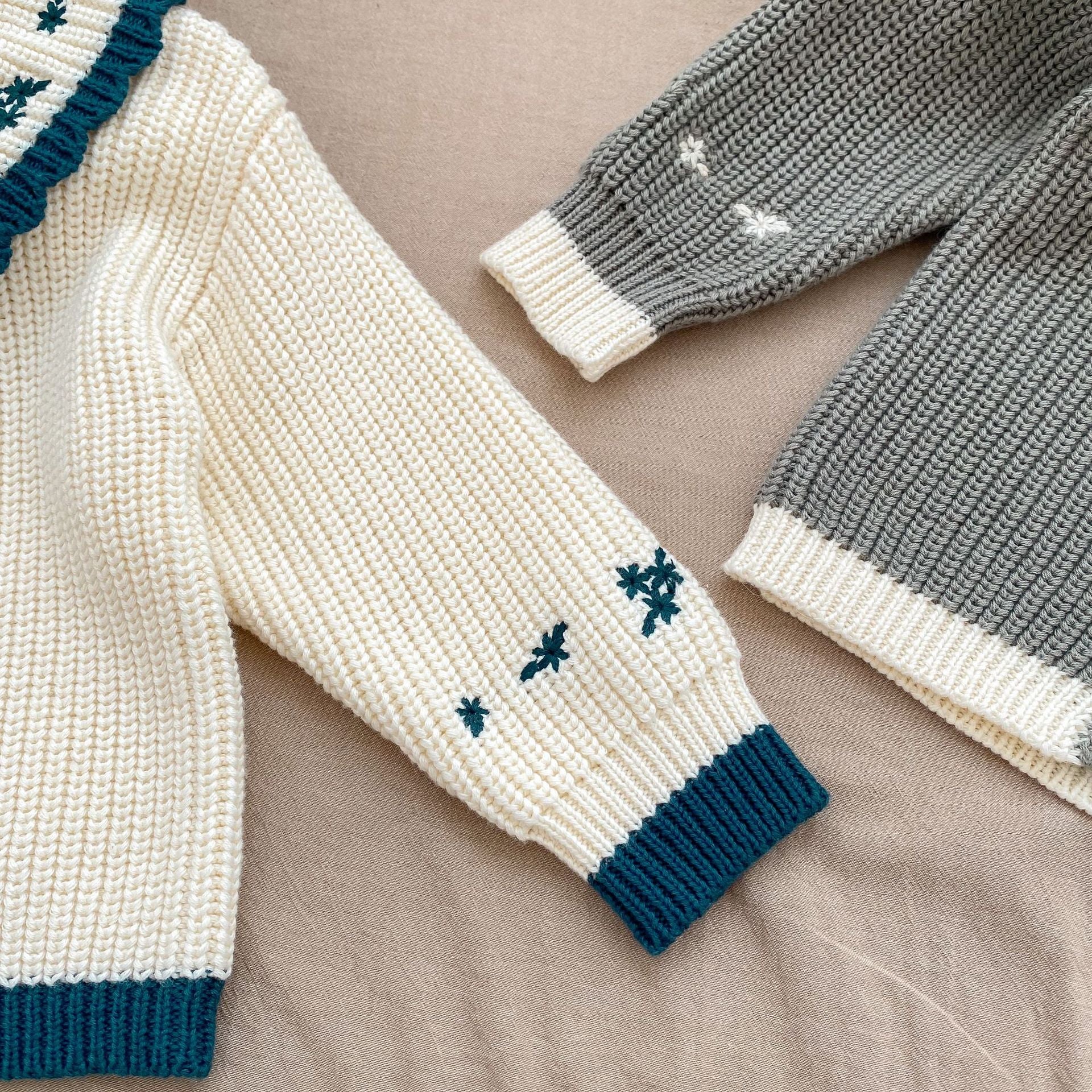 Infant baby girls' long sleeve knit cardigan in grey and beige with embroidery details, perfect for spring and autumn wear.