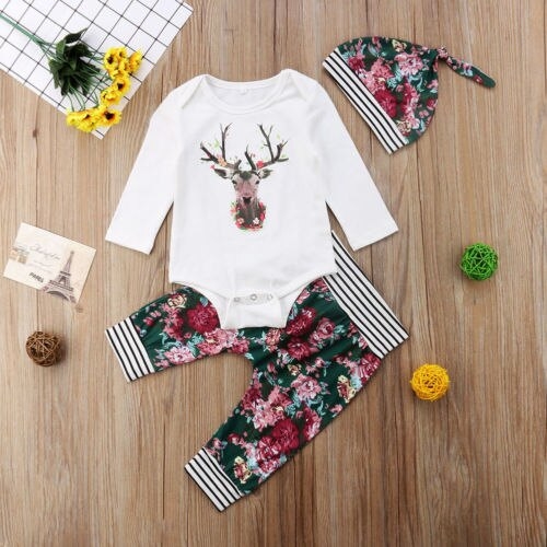 Model Number: Girls Deer Tops Romper Floral Pants 3Pcs Outfit Set