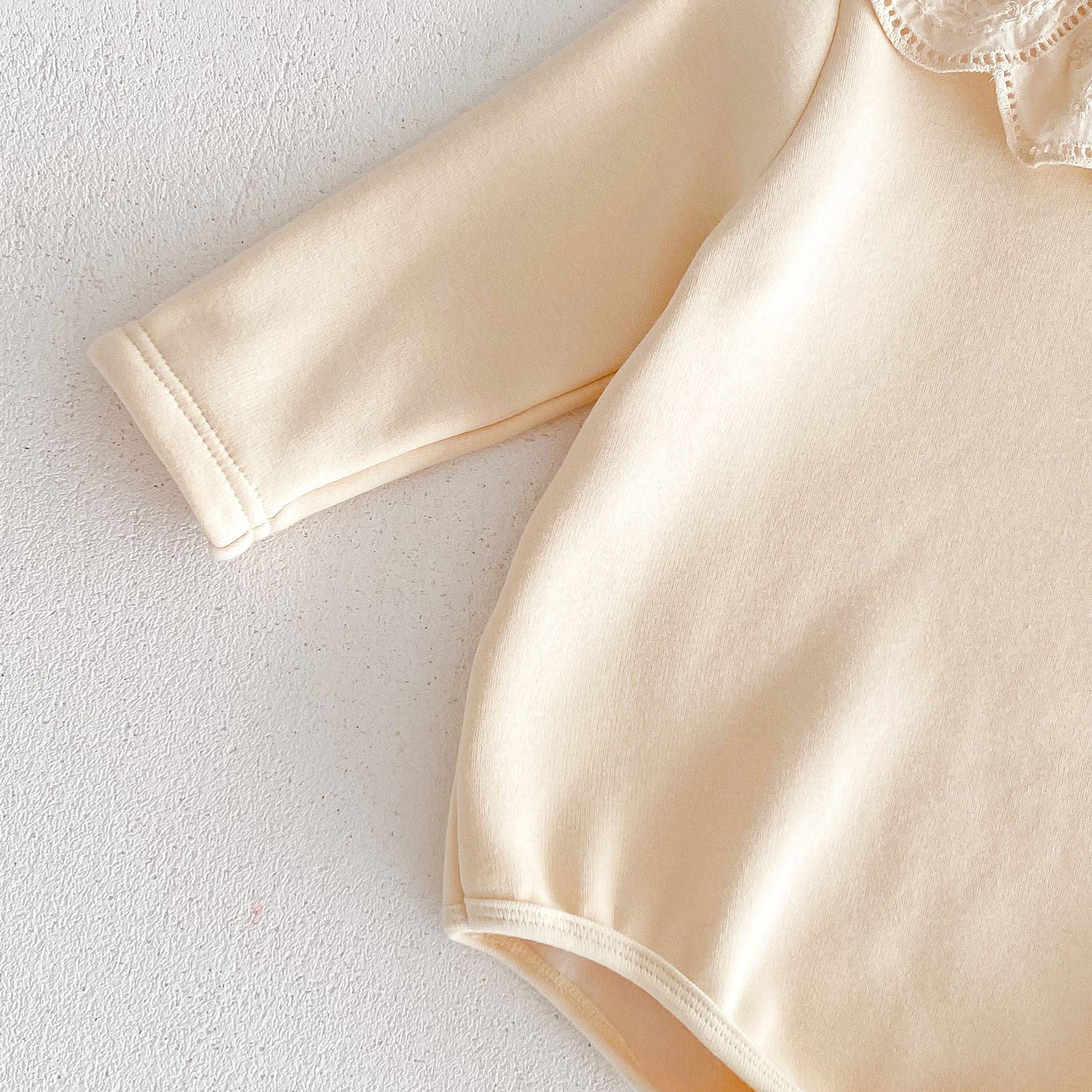 Introducing the Newborn Baby Girls Crew Neck Lace Collar Long Sleeves in a charming solid beige color. This adorable outfit is designed to keep your little one comfortable while looking stylish. Made from a soft blend of cotton and polyester, it ensures breathability and ease of movement for your baby girl. The elegant lace collar adds a touch of sophistication, making it perfect for special occasions or everyday wear.