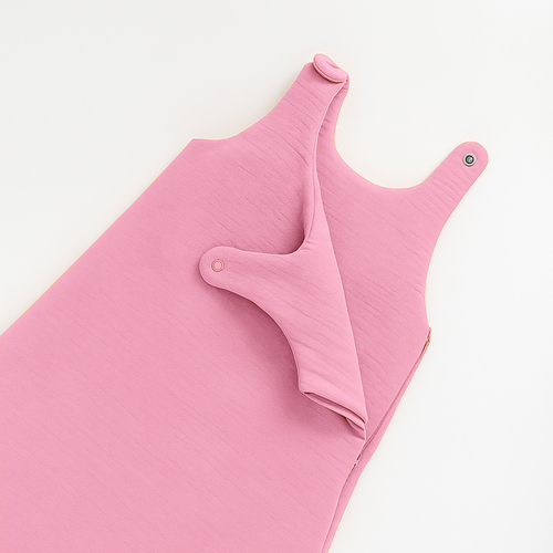The fabric is made of 100% organic double gauze cotton. The sleeping bag features clips at the shoulders and a full-side zipper for easy use.