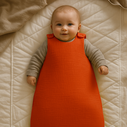 The fabric is made of 100% organic double gauze cotton. The sleeping bag features clips at the shoulders and a full-side zipper for easy use.