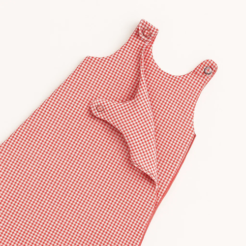 The fabric is made of 100% organic double gauze cotton. The sleeping bag features clips at the shoulders and a full-side zipper for easy use.