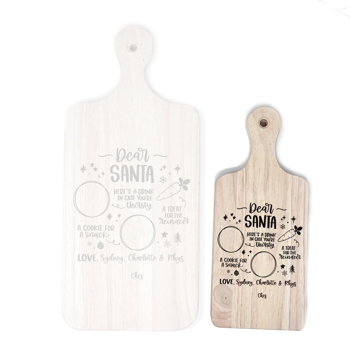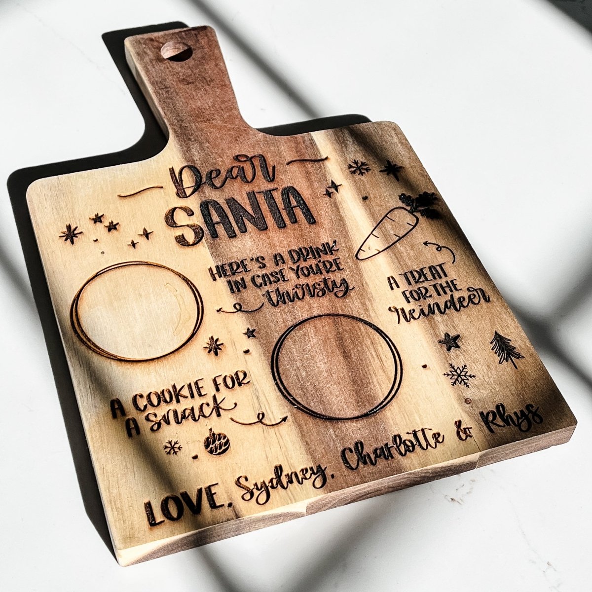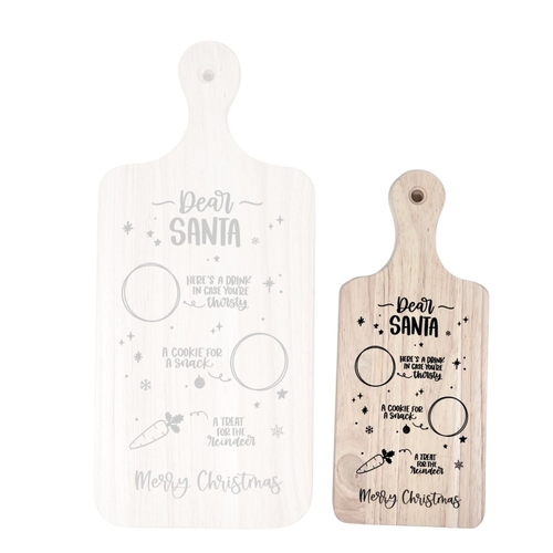 Bring the magic of Christmas into your home with our personalized wood Santa tray cutting board. This beautifully crafted tray is not only a functional kitchen accessory but also a delightful way to celebrate the holiday season. Each tray is custom made, featuring your child's or family name, and is laser engraved for lasting quality. Imagine the joy on your child's face when they see their name on a special tray set out for Santa!