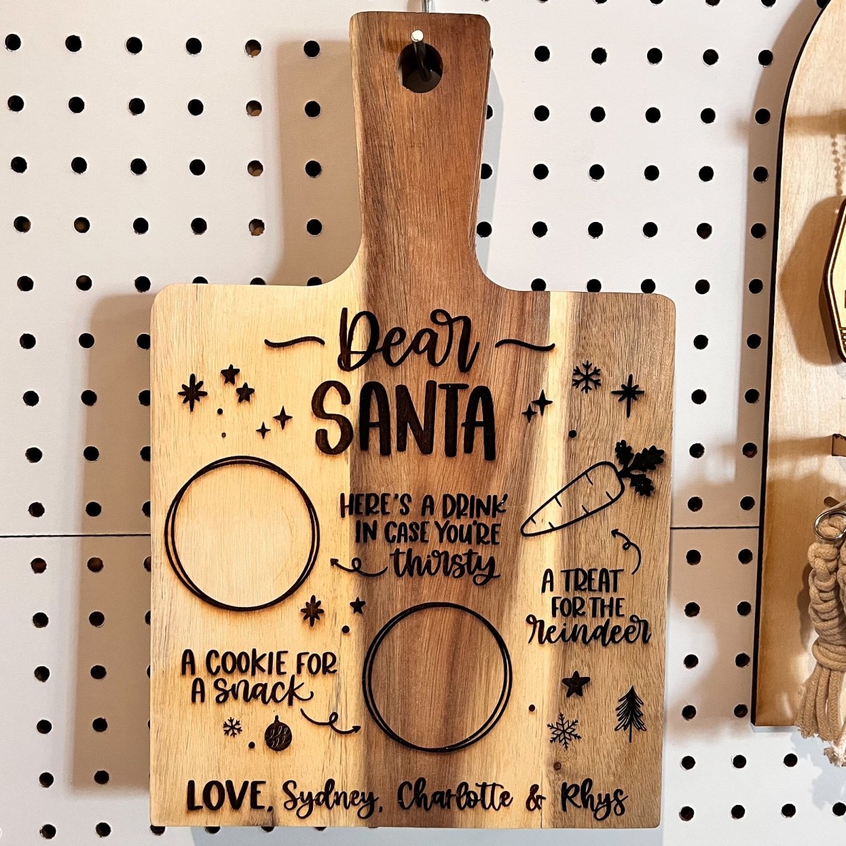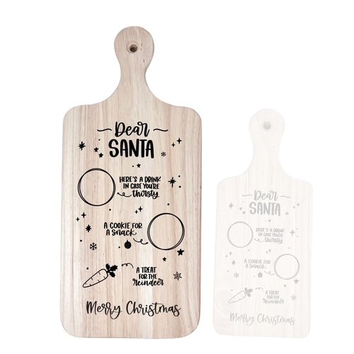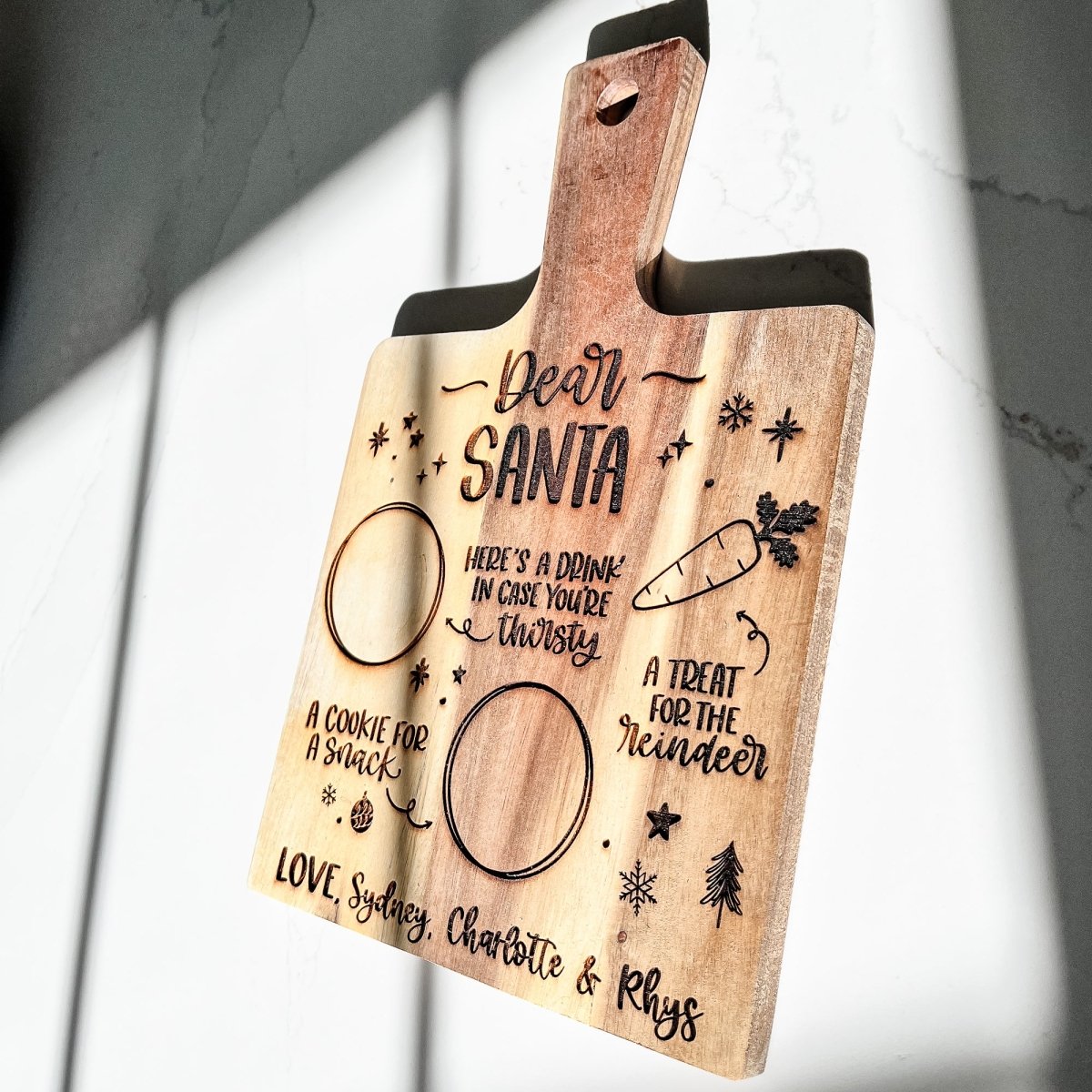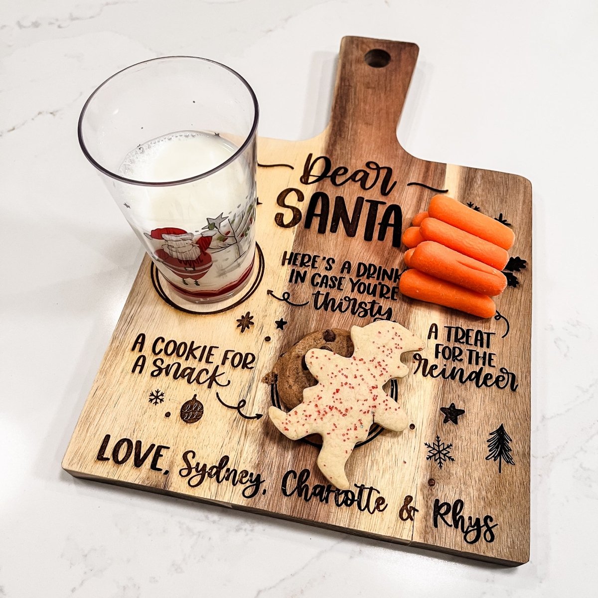 Bring the magic of Christmas into your home with our personalized wood Santa tray cutting board. This beautifully crafted tray is not only a functional kitchen accessory but also a delightful way to celebrate the holiday season. Each tray is custom made, featuring your child's or family name, and is laser engraved for lasting quality. Imagine the joy on your child's face when they see their name on a special tray set out for Santa!