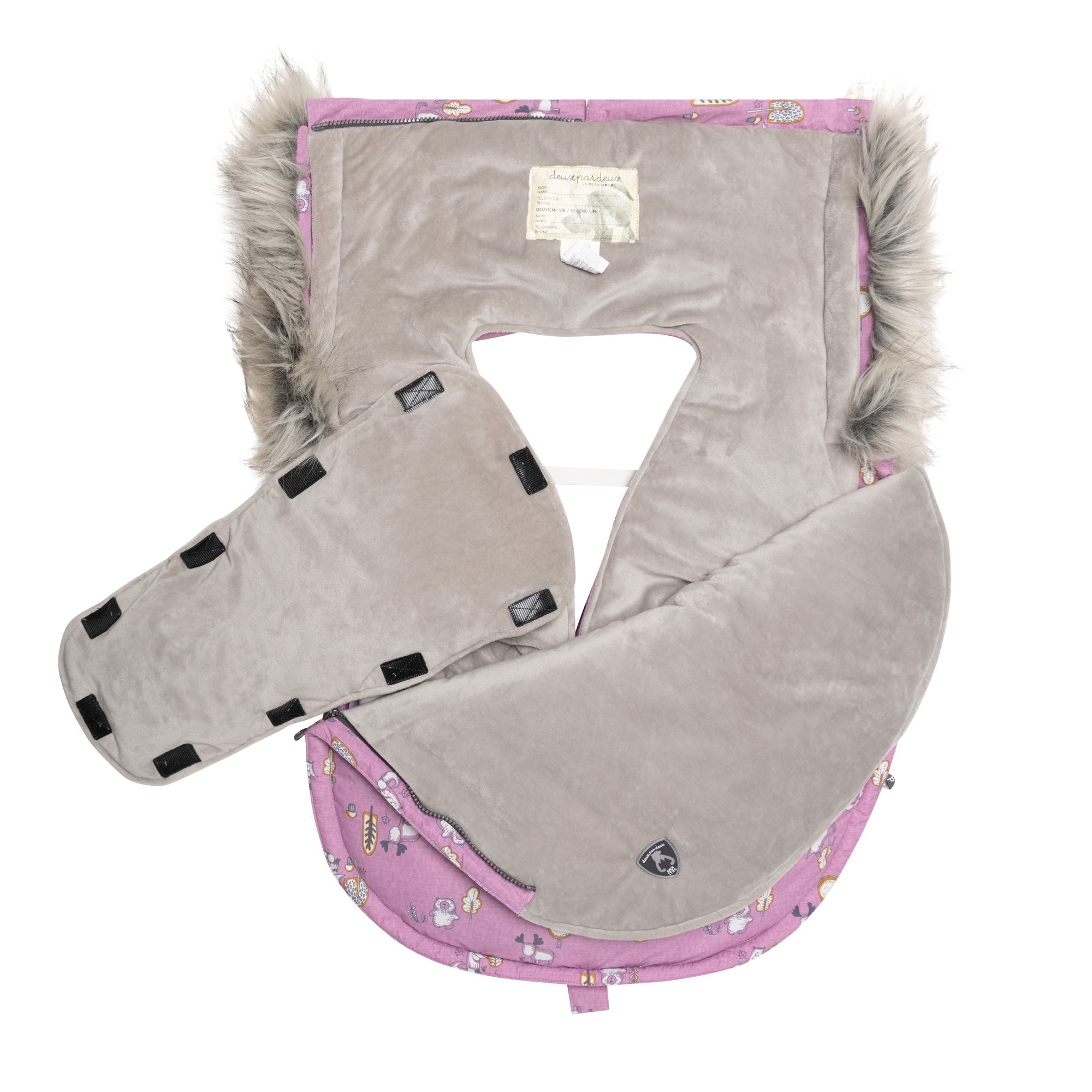 Introducing the Printed Woodland Animals Baby Pouch in Lilac, designed to make car rides comfortable and cozy for your little one, especially on chilly days. This adorable three-piece set is perfect for parents who want to ensure their baby stays warm and snug while traveling. The pouch features a delightful woodland animals print that adds a touch of charm to your baby's travel gear.