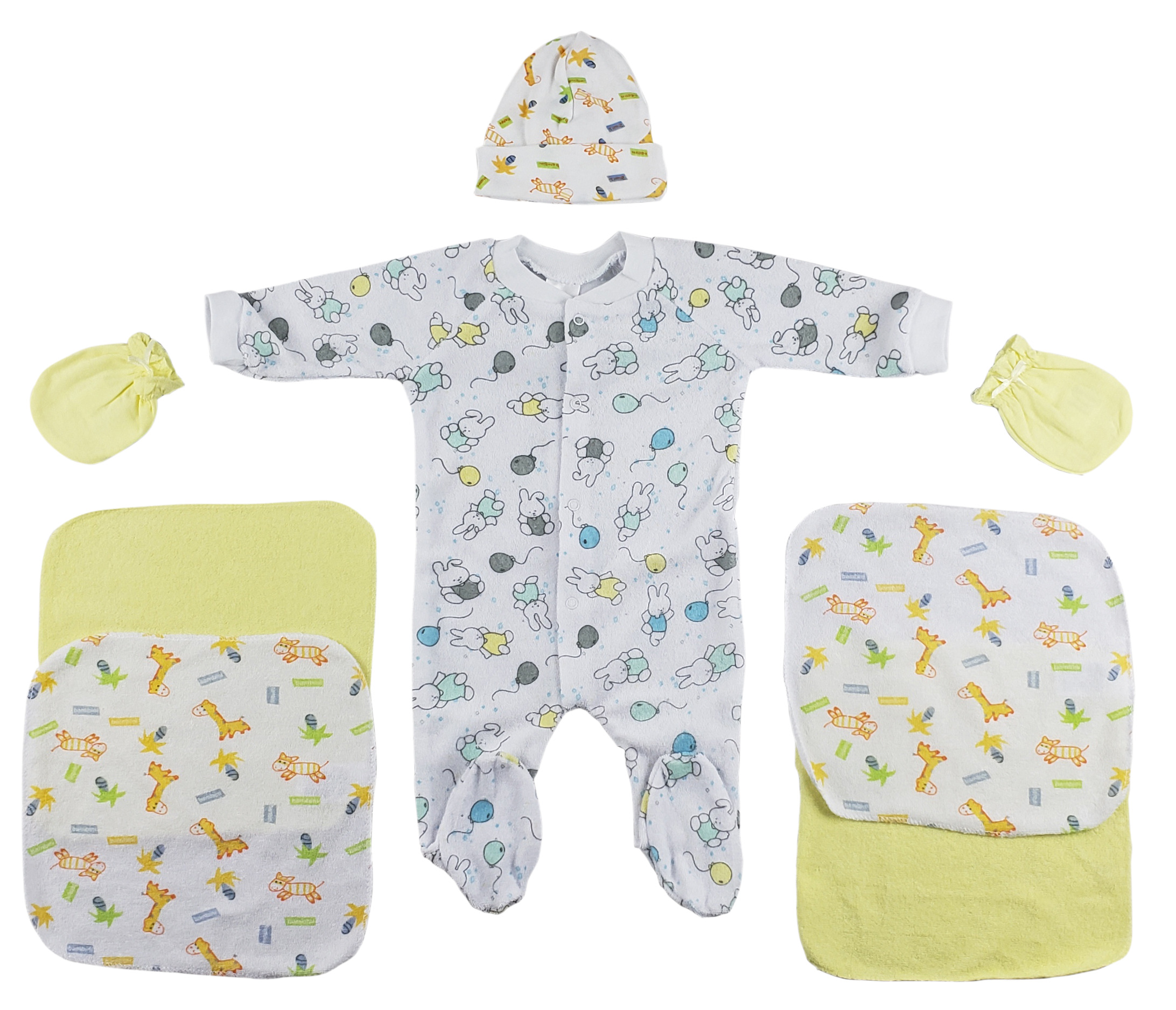 This 7-piece set includes everything you need to keep your newborn cozy and clean. The set features a terry sleep 'n play designed for infants aged 0-3 months, a printed baby cap to keep their head warm, and a four-piece washcloth set for bath time. Additionally, the yellow infant mittens are perfect for preventing your little one from scratching their face. Each item is thoughtfully designed to cater to the needs of newborns, making this set a practical choice for new parents.