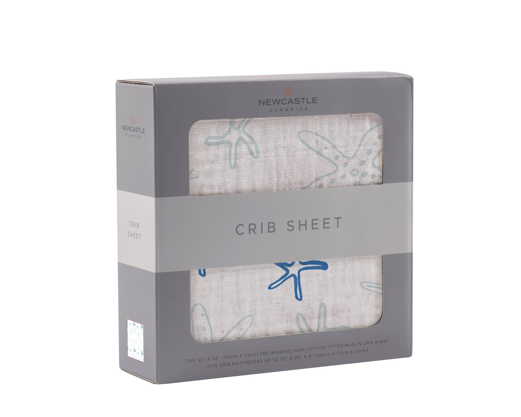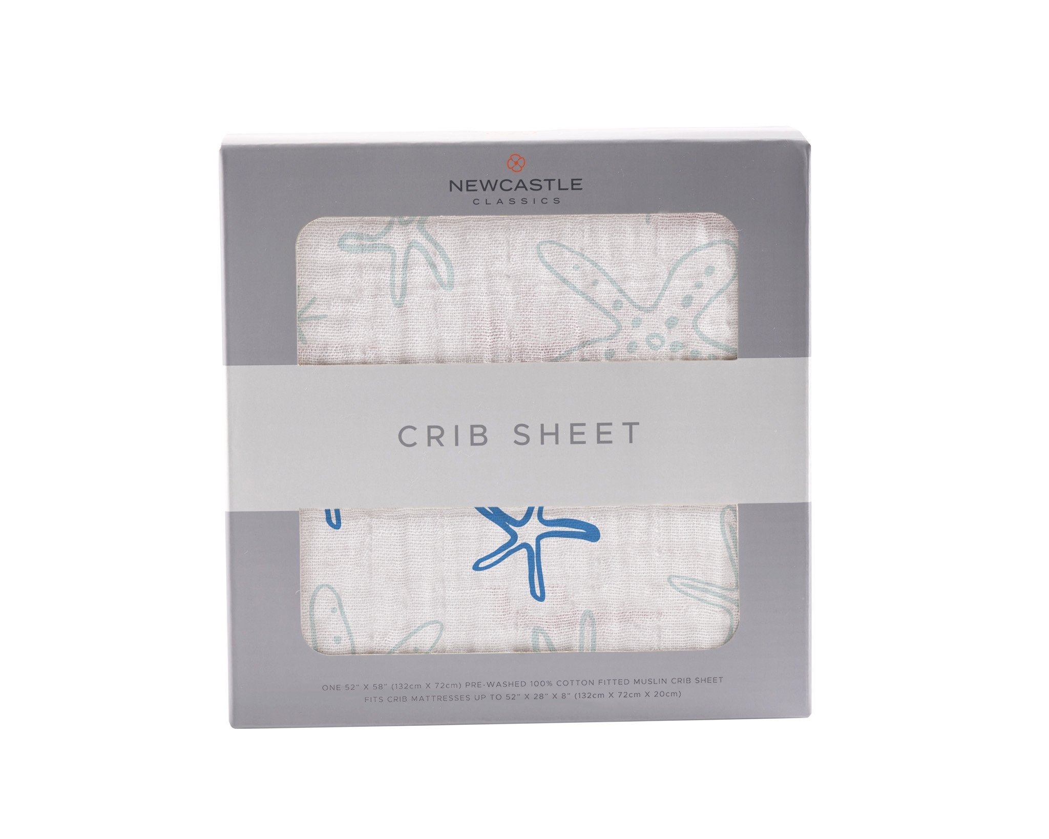 Starfish Cotton Muslin Crib Sheet featuring a whimsical starfish design, made from soft and breathable 100% natural cotton muslin.