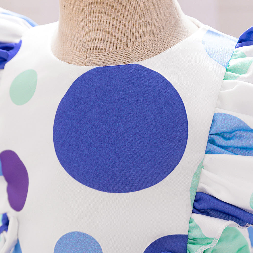 Introducing the Summer Baby Kids Girls Fly Sleeves Crew Neck Fashion Polka Dots Dress, a delightful addition to your little girl's wardrobe. This charming dress features a playful polka dot pattern that is perfect for summer outings, birthday parties, or family gatherings. Made from a soft and breathable cotton and polyester blend, it ensures your child stays comfortable while looking stylish.