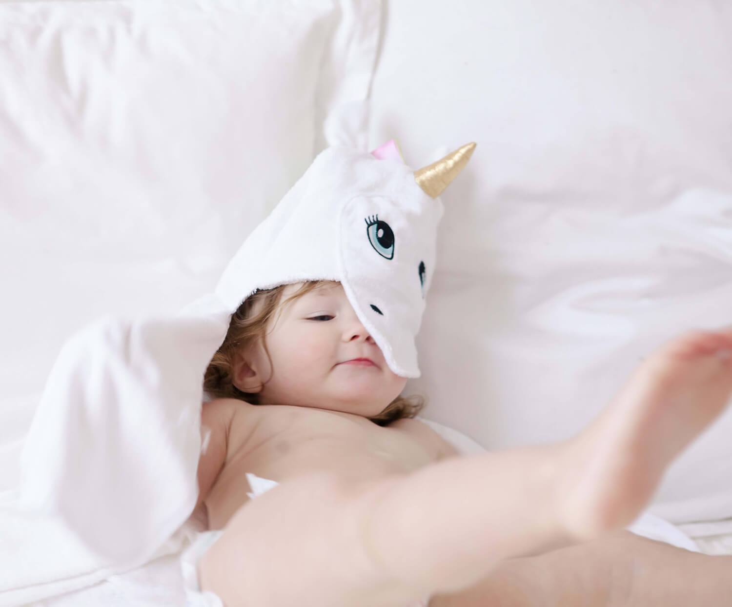 Crafted from the softest bamboo fabric, the White Unicorn Hooded Towel is designed to be 4X more absorbent than traditional cotton towels. This means that it can quickly soak up water without the need for vigorous rubbing, ensuring your baby stays warm and dry after bath time. The plush texture of the towel is gentle against delicate skin, making it perfect for newborns, infants, and toddlers alike.