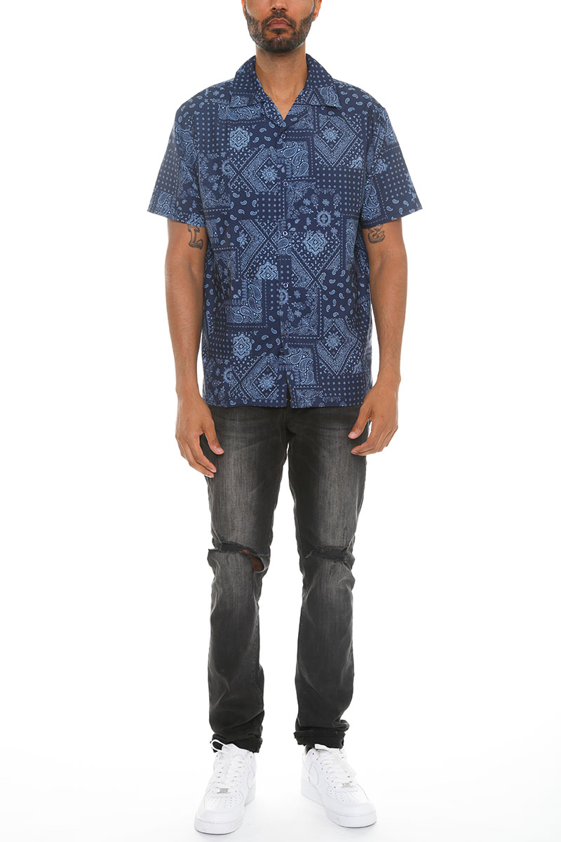 Men's paisley print button down shirt featuring a vibrant design, short sleeves, and a classic collar, made from 100% polyester.