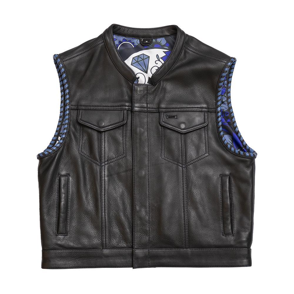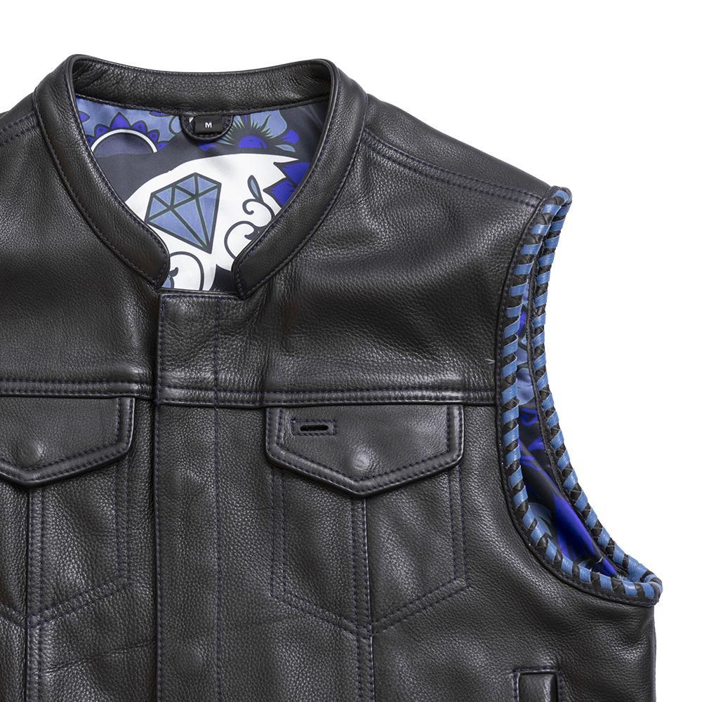 This jacket showcases a classic club-style design, featuring a one-inch collar and covered snaps that add to its sleek appearance. The cropped center zipper not only enhances the jacket's style but also provides ease of wear. The striking blue stitching contrasts beautifully with the black leather, giving it a distinctive look that is sure to turn heads.
