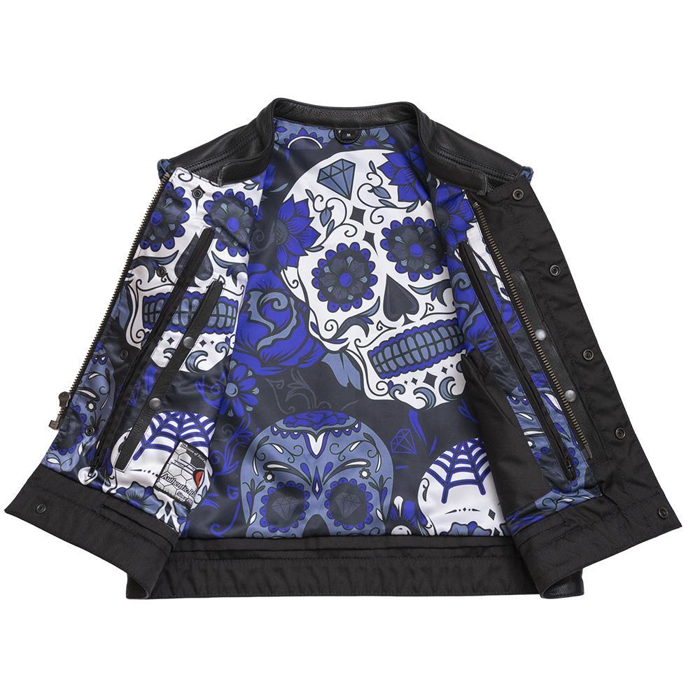 Crafted with precision, the Auction 025 SIZE M is equipped with durable YKK zippers that ensure longevity and reliability. The three-panel design includes a striking sugar skull lining, which adds an element of fun and flair to the jacket's interior. This attention to detail not only enhances the jacket's aesthetic appeal but also speaks to the quality craftsmanship that goes into each piece.