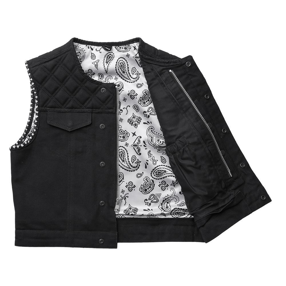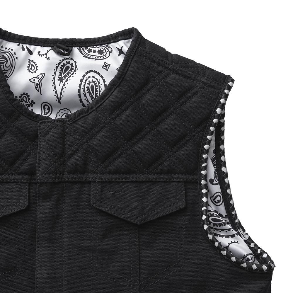 Crafted with attention to detail, the Auction 031 features black stitching and a striking black and white arm braid that adds a touch of flair. The single panel design showcases a white background with a black paisley inner lining, providing a stylish contrast that sets this jacket apart from the rest.