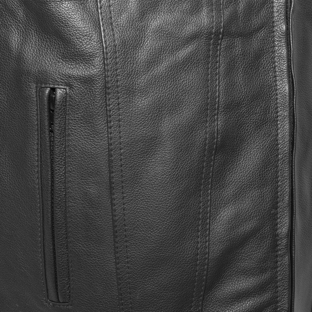 This vest features a classic club style with a v-neck and a center zipper, making it a timeless addition to any biker's wardrobe. The sleek black finish is complemented by black zippers and hardware, giving it a polished look that pairs well with any outfit. Whether you're cruising down the highway or attending a motorcycle rally, the Badlands vest will make you stand out.