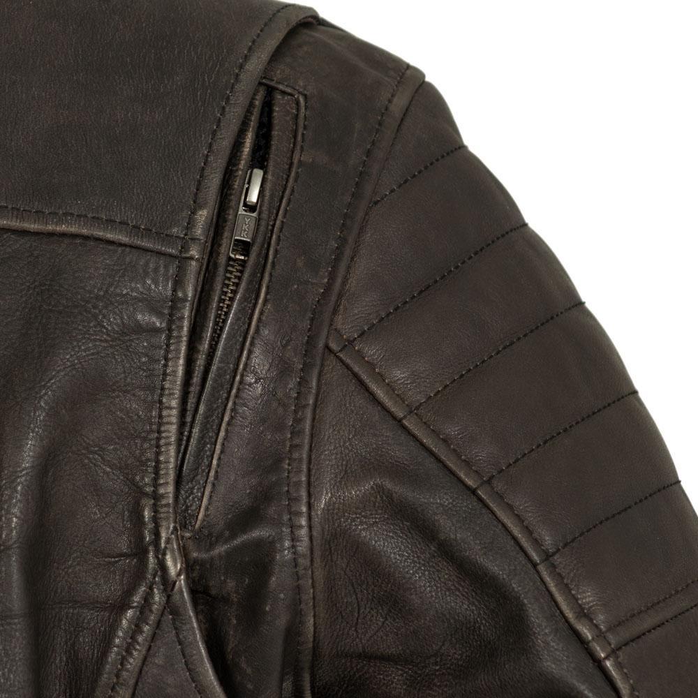 One of the standout features of this motorcycle jacket is its practicality. It includes two concealed carry pockets with tapered holsters, allowing you to securely carry your belongings. The padded shoulder and forearm details enhance protection, while the zippered pocket on the left arm offers additional storage for smaller items.