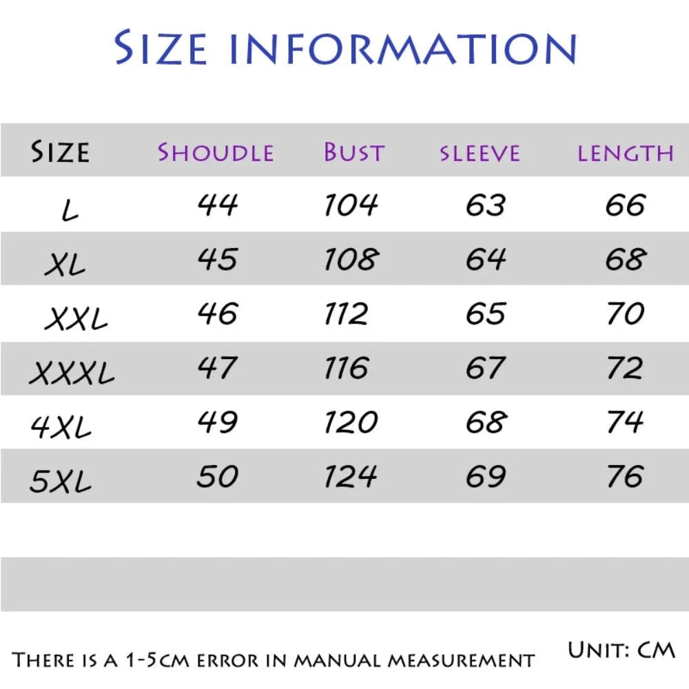 | 5XL (US XL) | 48.82" | 19.69" | 29.92" | 27.17" |
