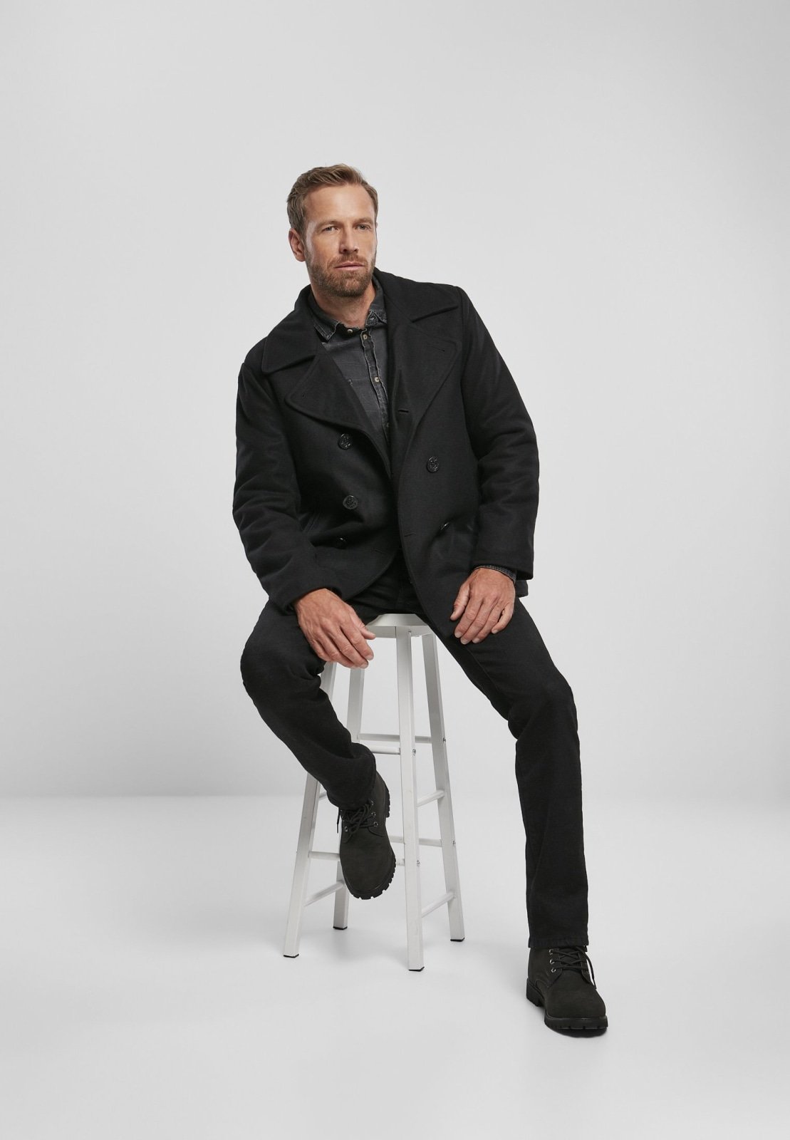 Chic Pea Coat in classic uniform style, featuring a wool-polyester blend, perfect for transitional weather, styled with jeans and leather shoes.