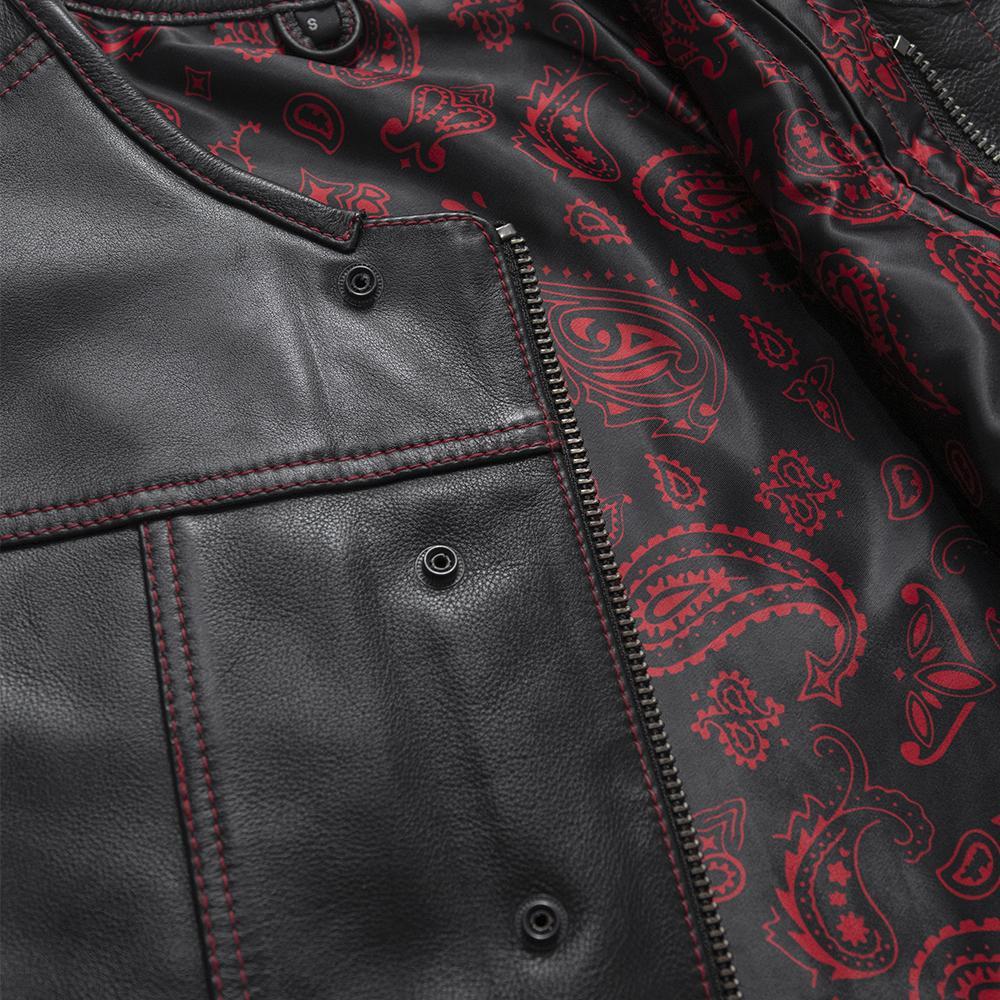 The vest features a striking black background with a vibrant red paisley inner lining. This unique design element adds a touch of flair and personality to the vest, making it stand out from the crowd. Whether you're at a motorcycle rally or a casual outing, the Slasher vest is sure to turn heads.