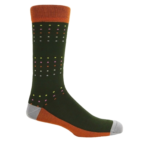 Square Polka Men's Socks in green and orange with multi-coloured square polka dots, showcasing luxury and style.