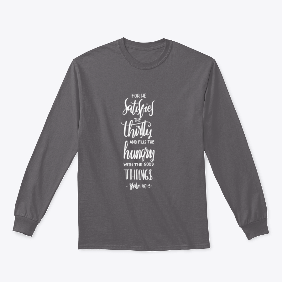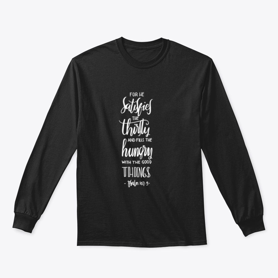 Introducing our unique t-shirt, designed with a powerful message: 'For He Satisfies The Thirsty And Fills The Hungry With The Good Things.' This shirt is not just a piece of clothing; it’s a statement of faith and a reminder of the abundance that life offers. Made from high-quality materials, this t-shirt is perfect for anyone looking to express their beliefs while enjoying comfort and style.