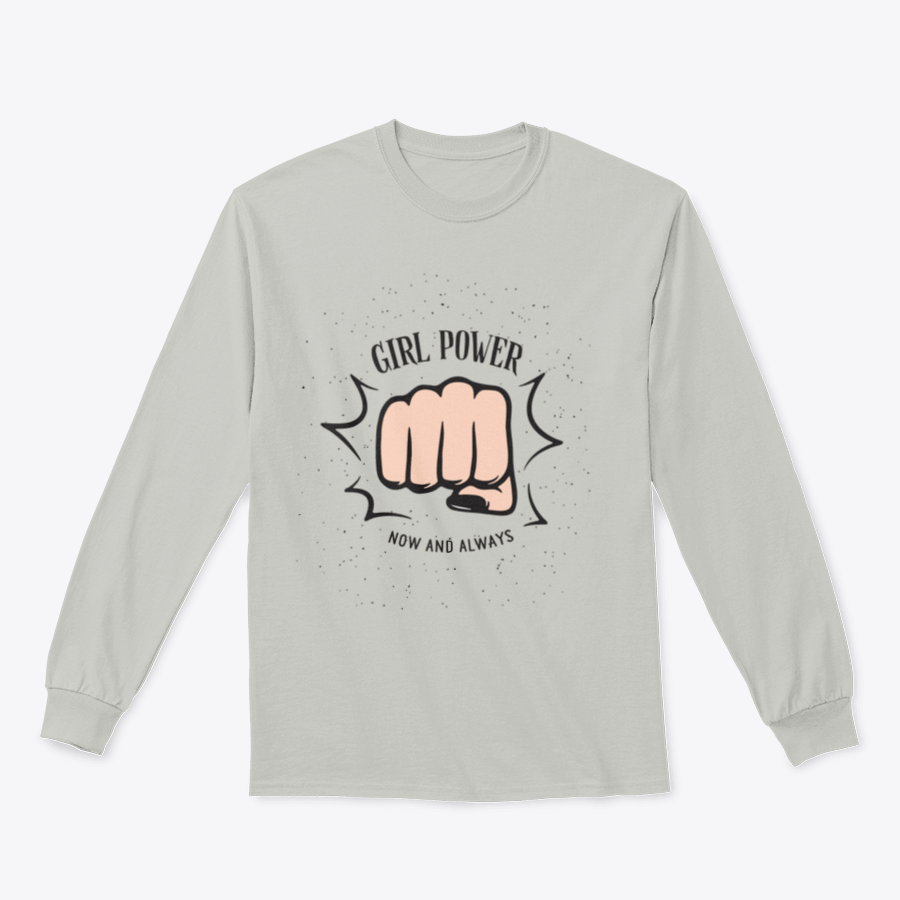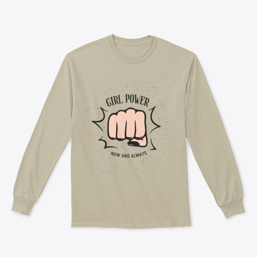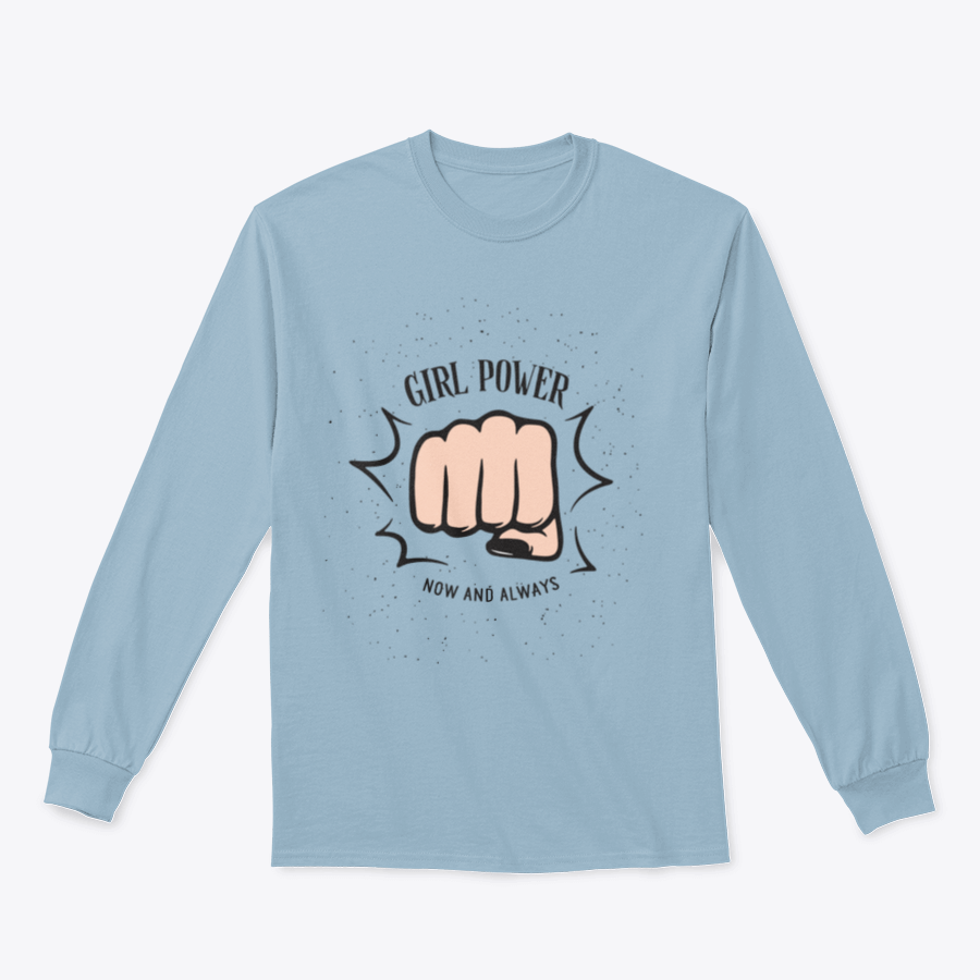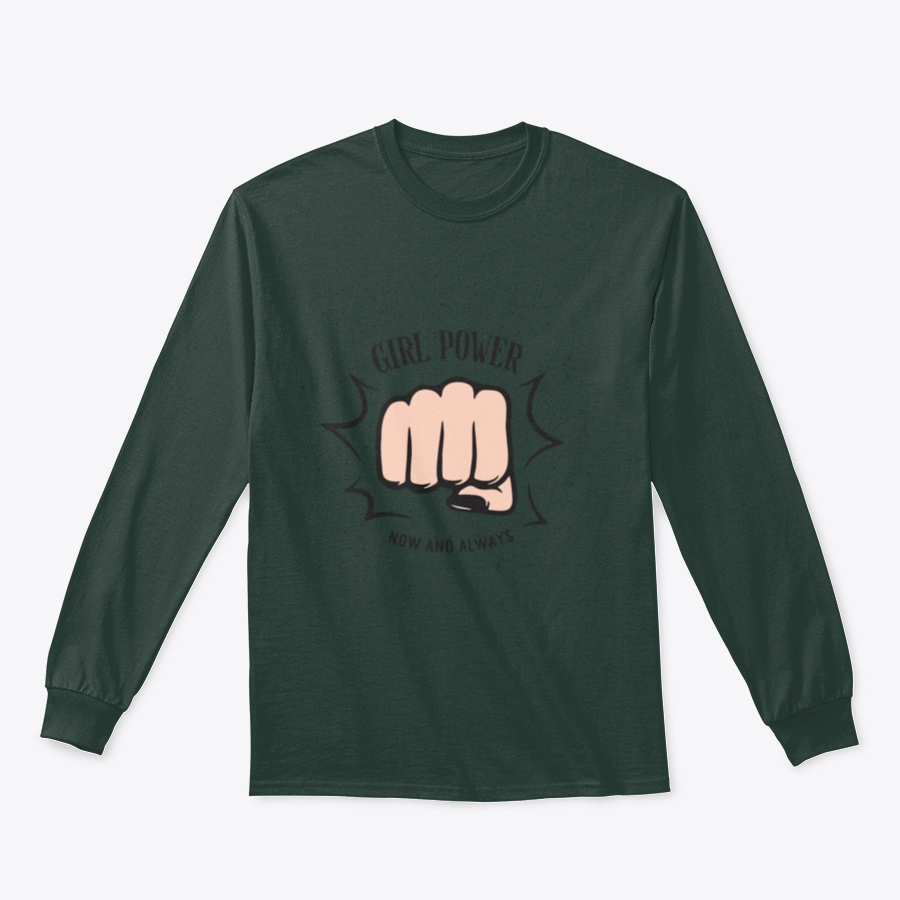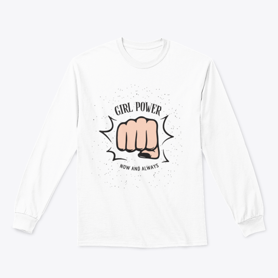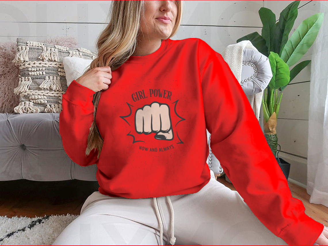 A stylish sweatshirt featuring a bold female fist design with the quote 'Girl Power Now And Always', perfect for empowering women.