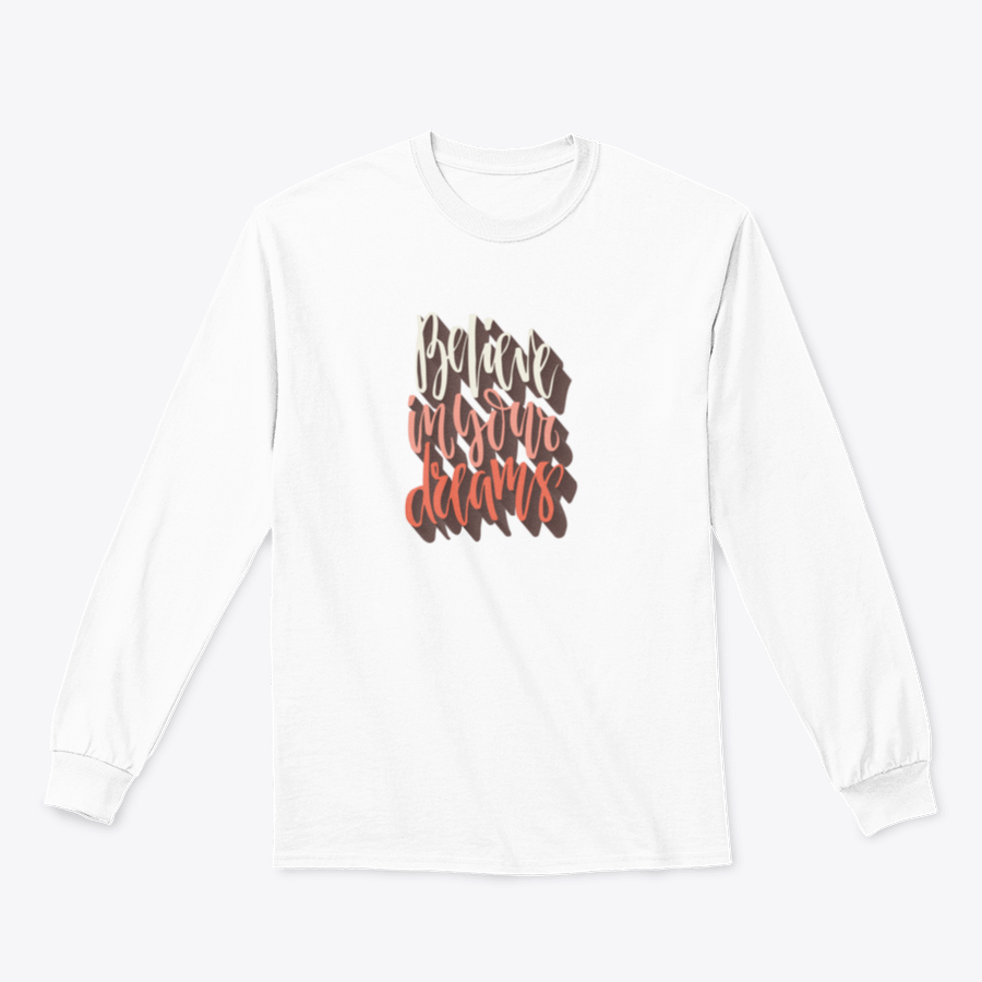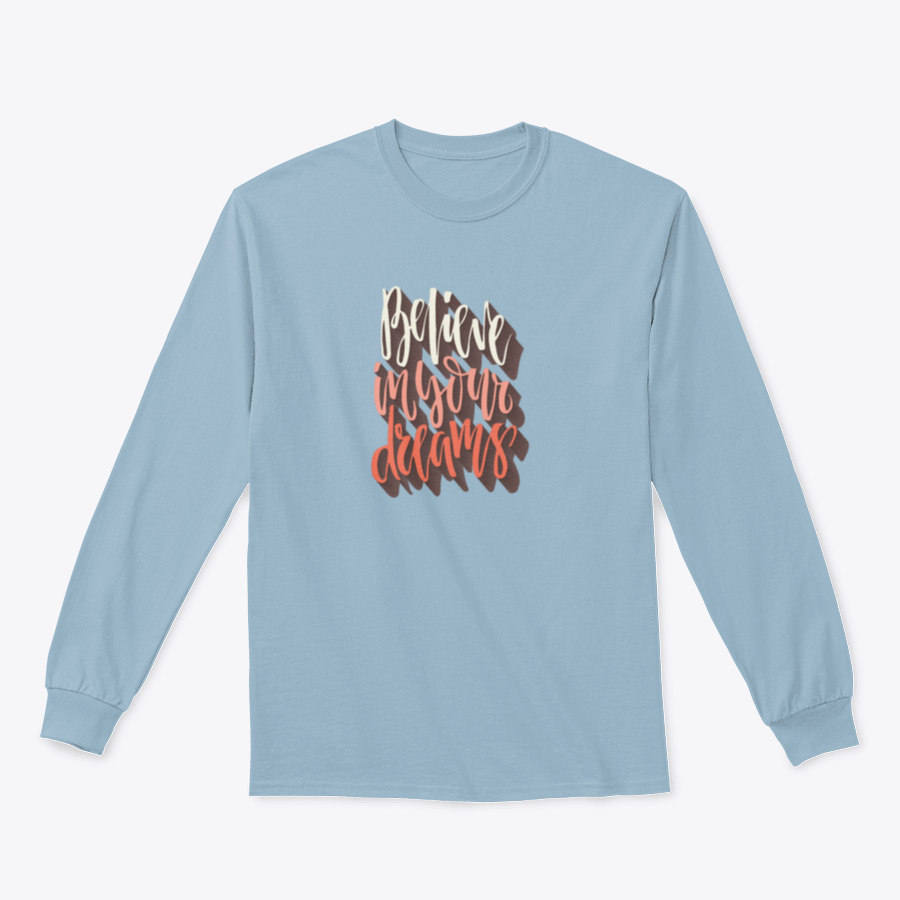 A comfortable cotton shirt featuring hand-drawn lettering that says 'Believe In Your Dreams', showcasing a classic fit and midweight fabric.