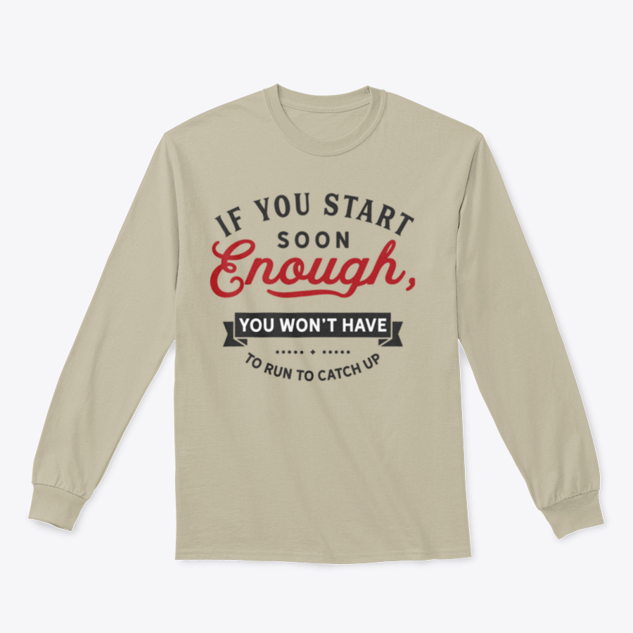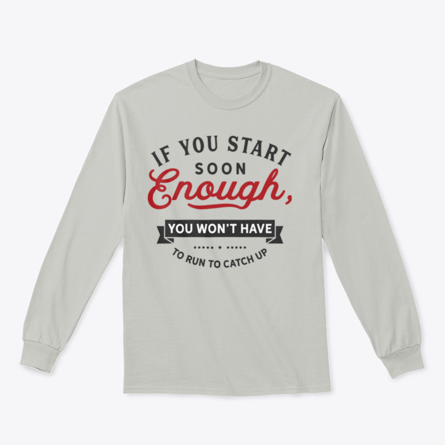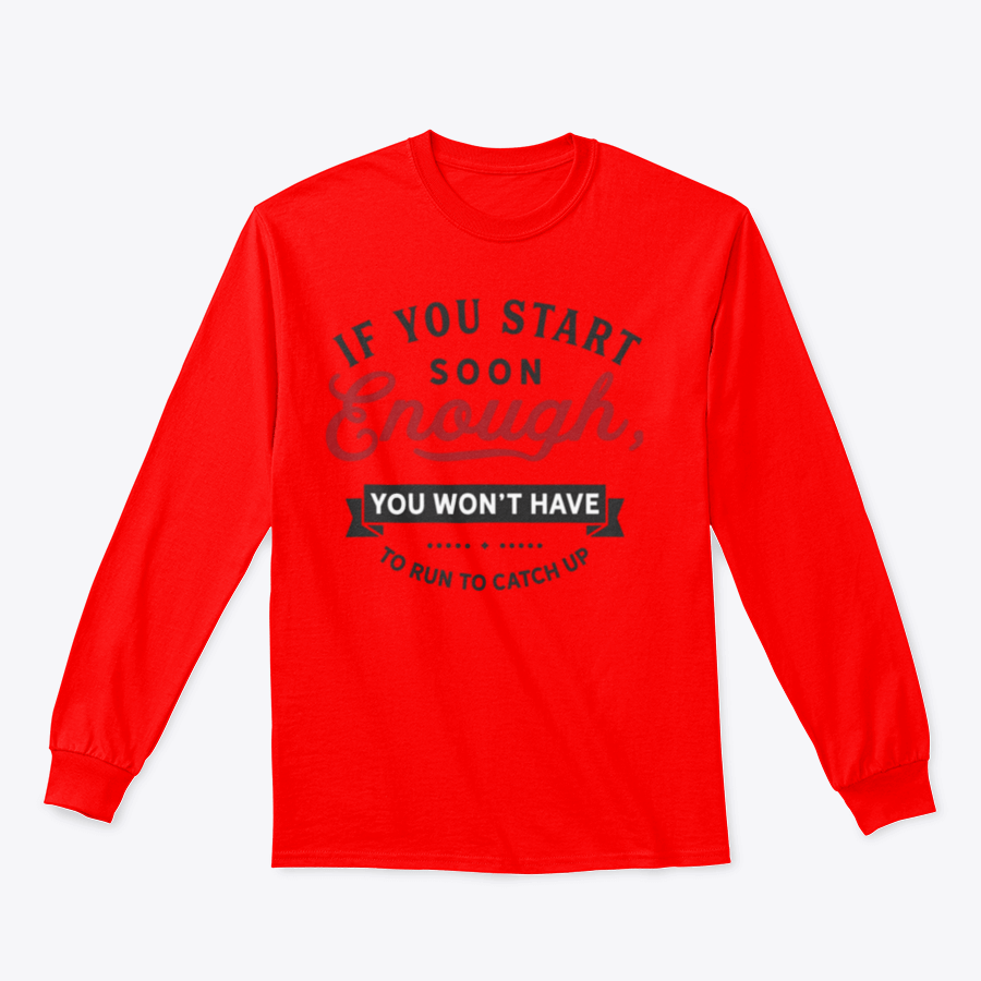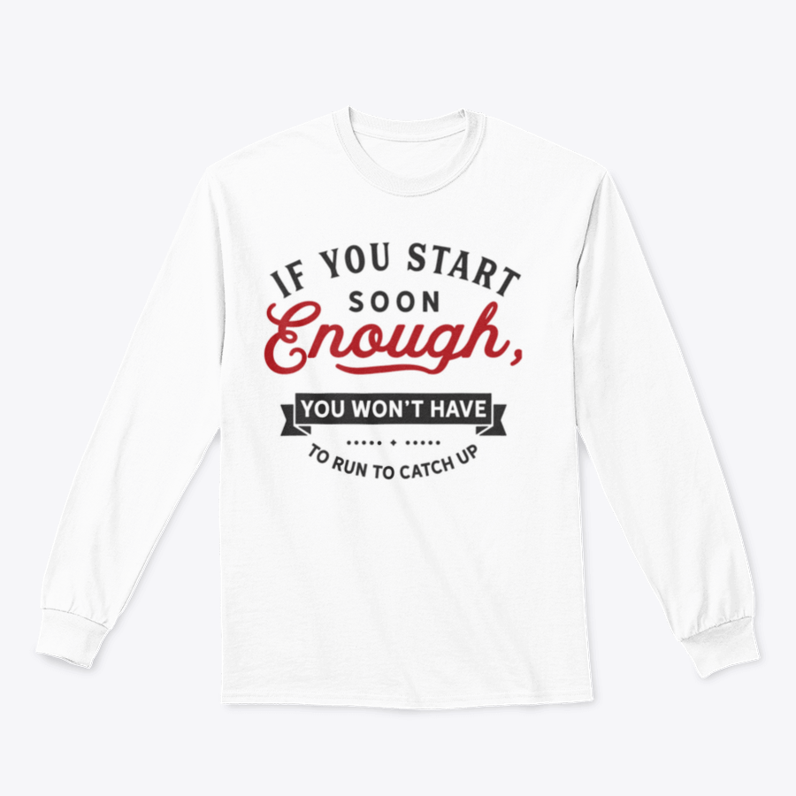 In summary, our 'If You Start Soon Enough, You Won't Have To Run To Catch Up' design is the perfect addition to your wardrobe. With its high-quality materials, comfortable fit, and motivational message, it's designed to support you on your journey towards achieving your fitness goals. Don't wait any longer; start your journey today with this inspiring apparel!