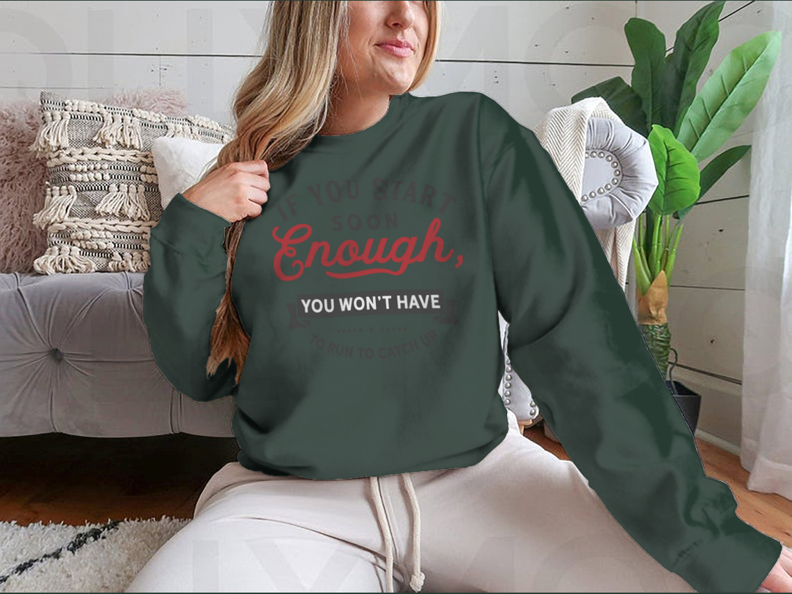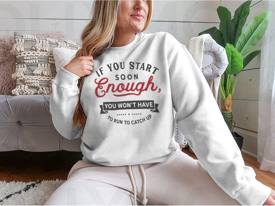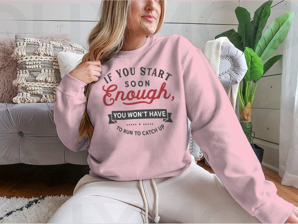 Whether you're working out, lounging at home, or out with friends, our 'If You Start Soon Enough' design is versatile enough to suit any occasion. Pair it with your favorite leggings, shorts, or jeans for a stylish yet comfortable look. The motivational message serves as a reminder to stay focused on your goals, making it not just a piece of clothing but a source of inspiration.