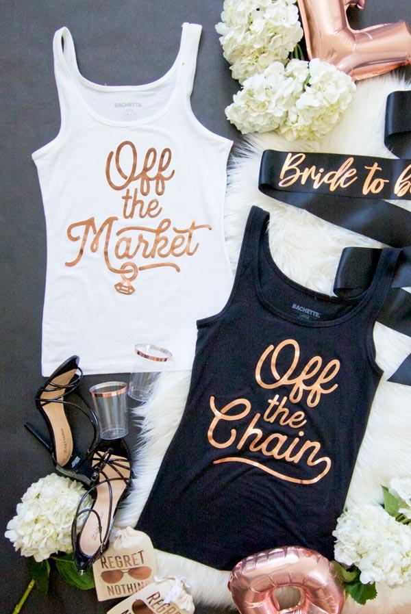 Our tanks feature two eye-catching designs: the white tank reads "Off the Market" while the black tank proudly displays "Off the Chain." Both designs are perfect for showcasing your personality and making a bold statement. The trendy rose gold foil shines brightly, ensuring you stand out in any crowd. This exclusive design is hand-embellished, making each piece unique and special.
