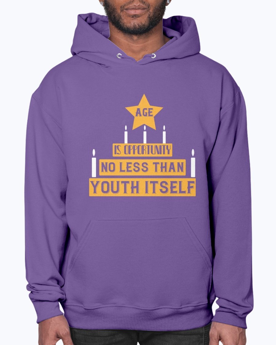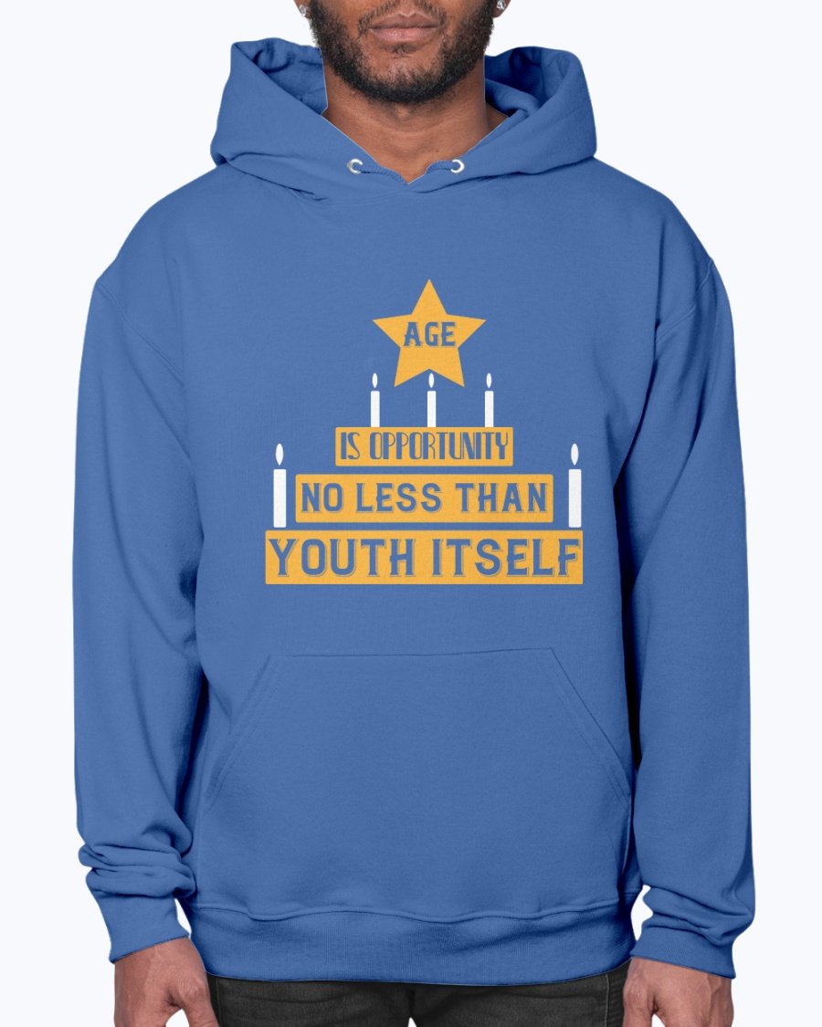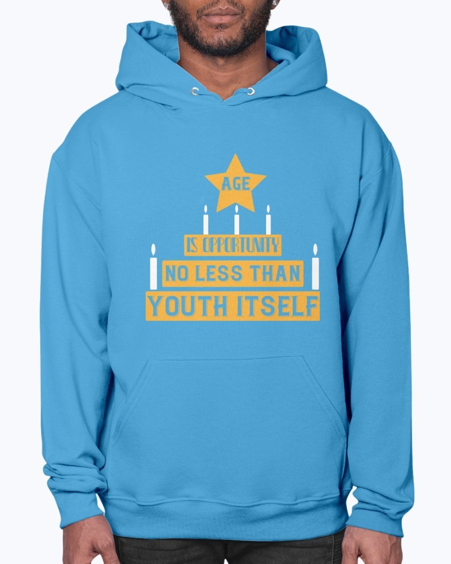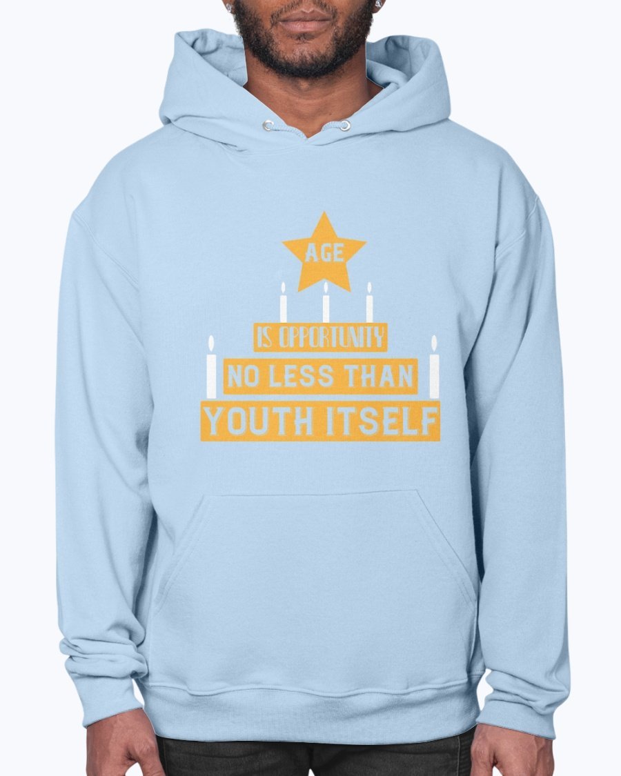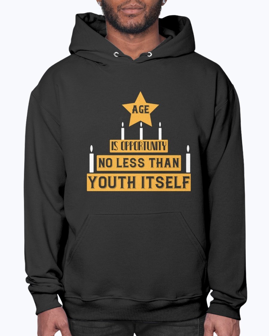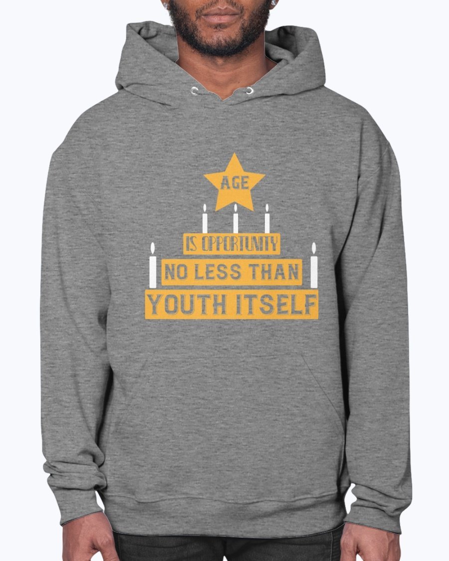 In summary, the 'Age is Opportunity No Less Than Youth Itself' Birthday Hoodie is more than just a garment; it’s a celebration of life, comfort, and style. Perfect for anyone who values the journey of aging, this hoodie is a must-have addition to your wardrobe or a thoughtful gift for someone special.
