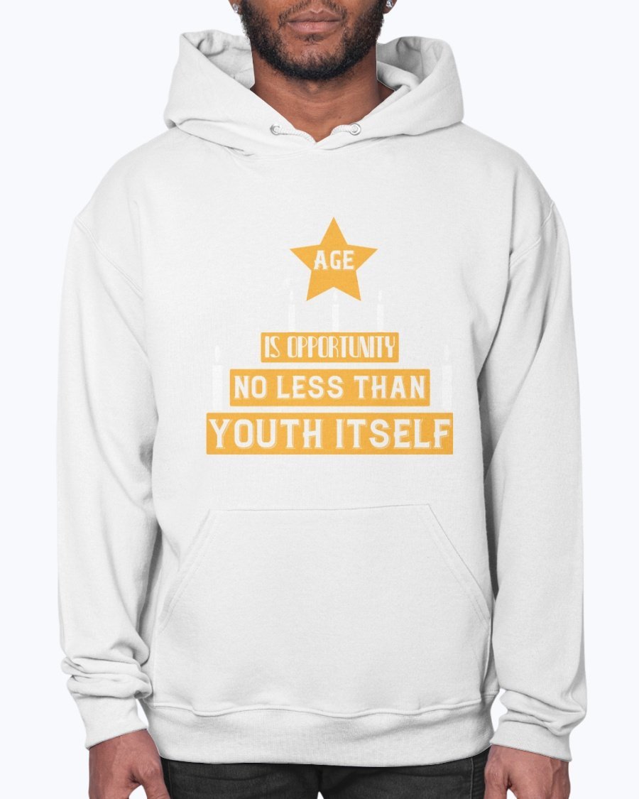 Featuring a front pouch pocket, this hoodie provides a convenient space for your essentials or a cozy spot for your hands. The high stitch density creates a smooth printing canvas, making it perfect for showcasing the inspiring message: 'Age is Opportunity No Less Than Youth Itself.' The single-needle top-stitch on the front neck adds a touch of elegance to the overall design.