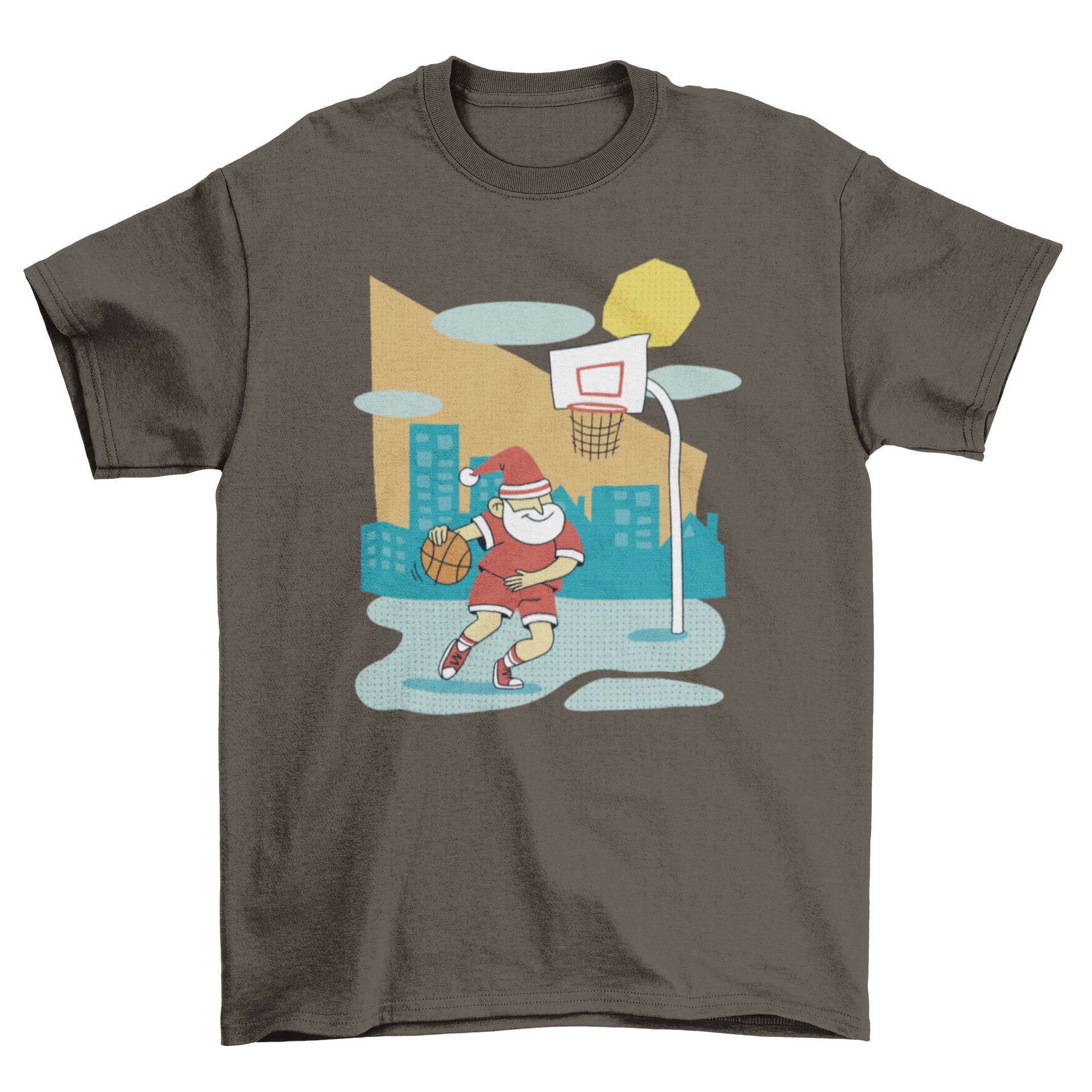 A vibrant cartoon-style t-shirt featuring Santa Claus playing basketball, showcasing a fun and festive design.