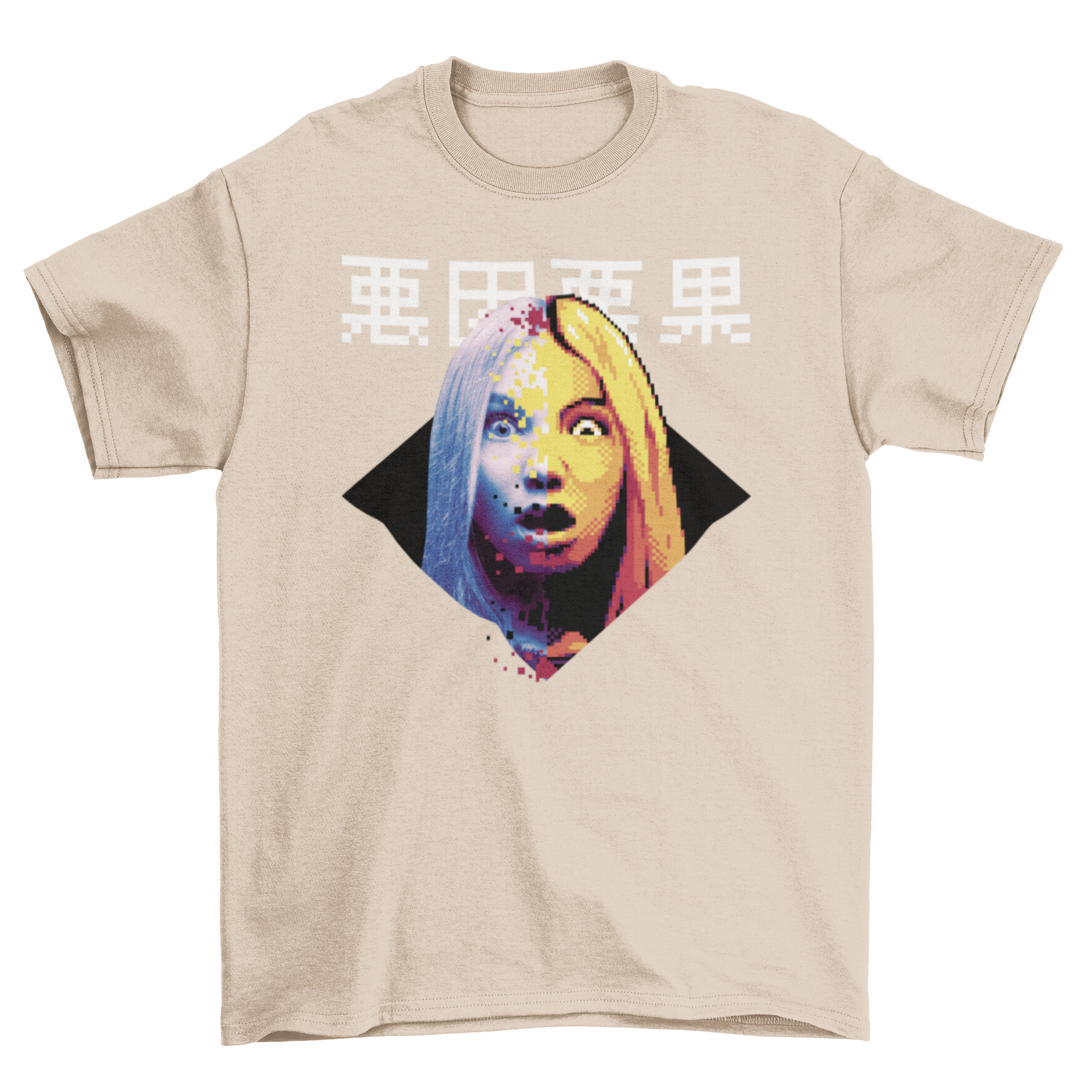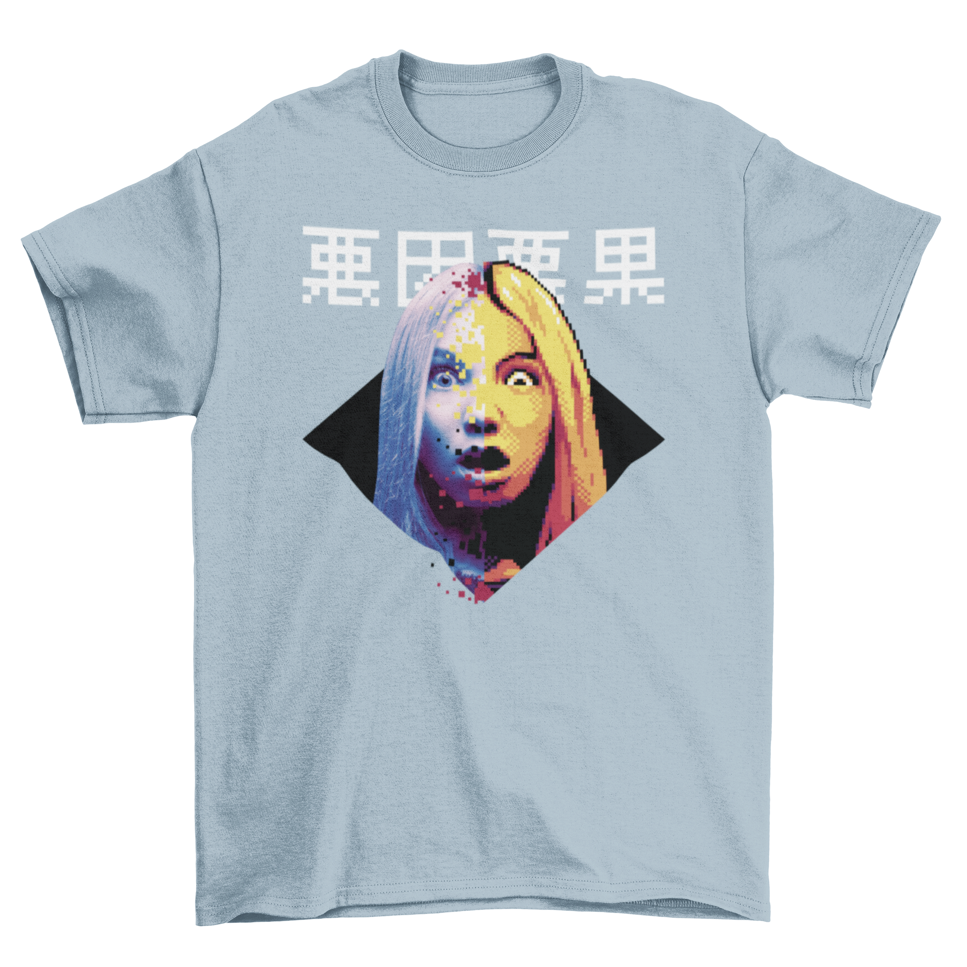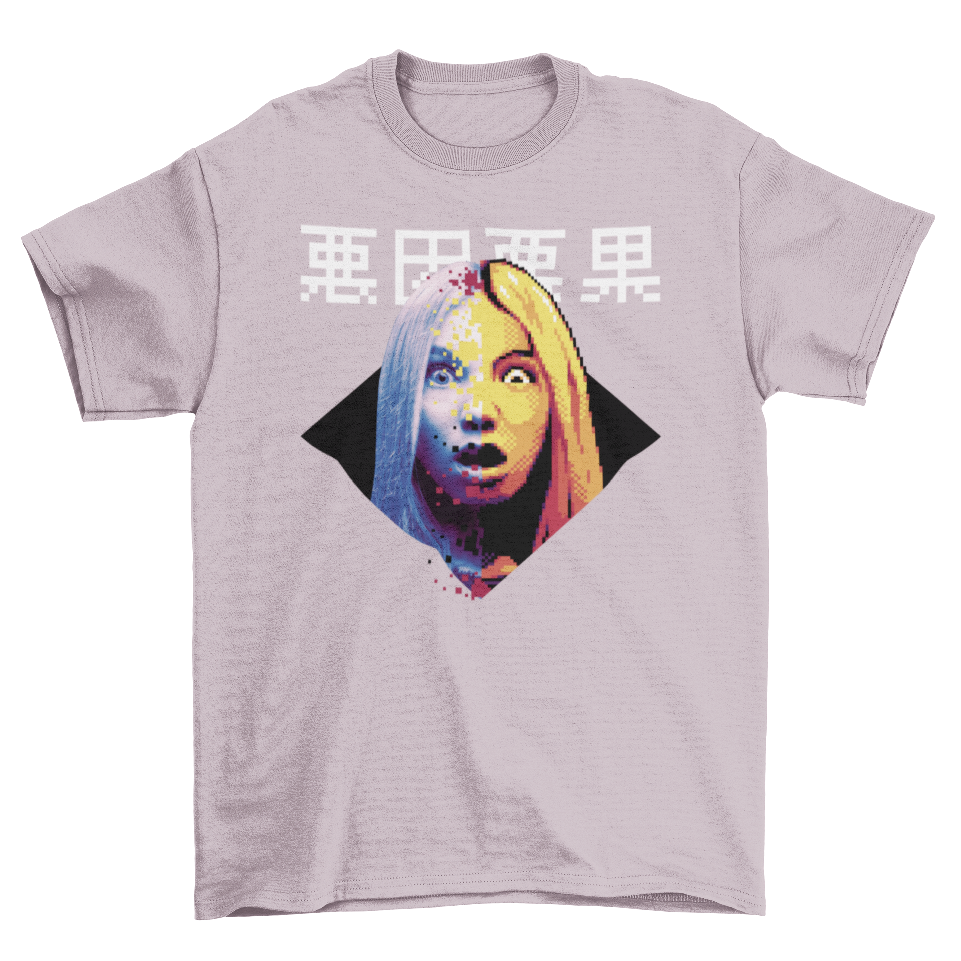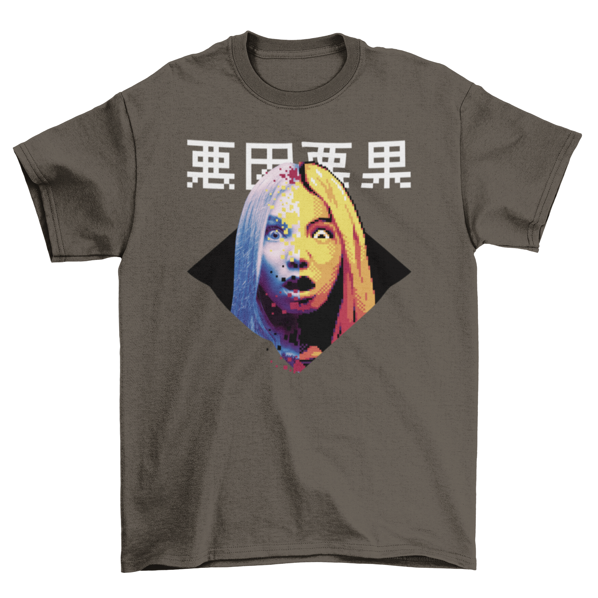 Introducing the Amazing Surprised Fashion t-shirt, a unique piece that combines art and philosophy. This t-shirt features a stunning pixel art design of a woman, capturing attention with its vibrant colors and intricate details. The accompanying Japanese quote, 'Evil cause, evil effect', adds a layer of depth and meaning, making it not just a fashion statement but also a conversation starter.