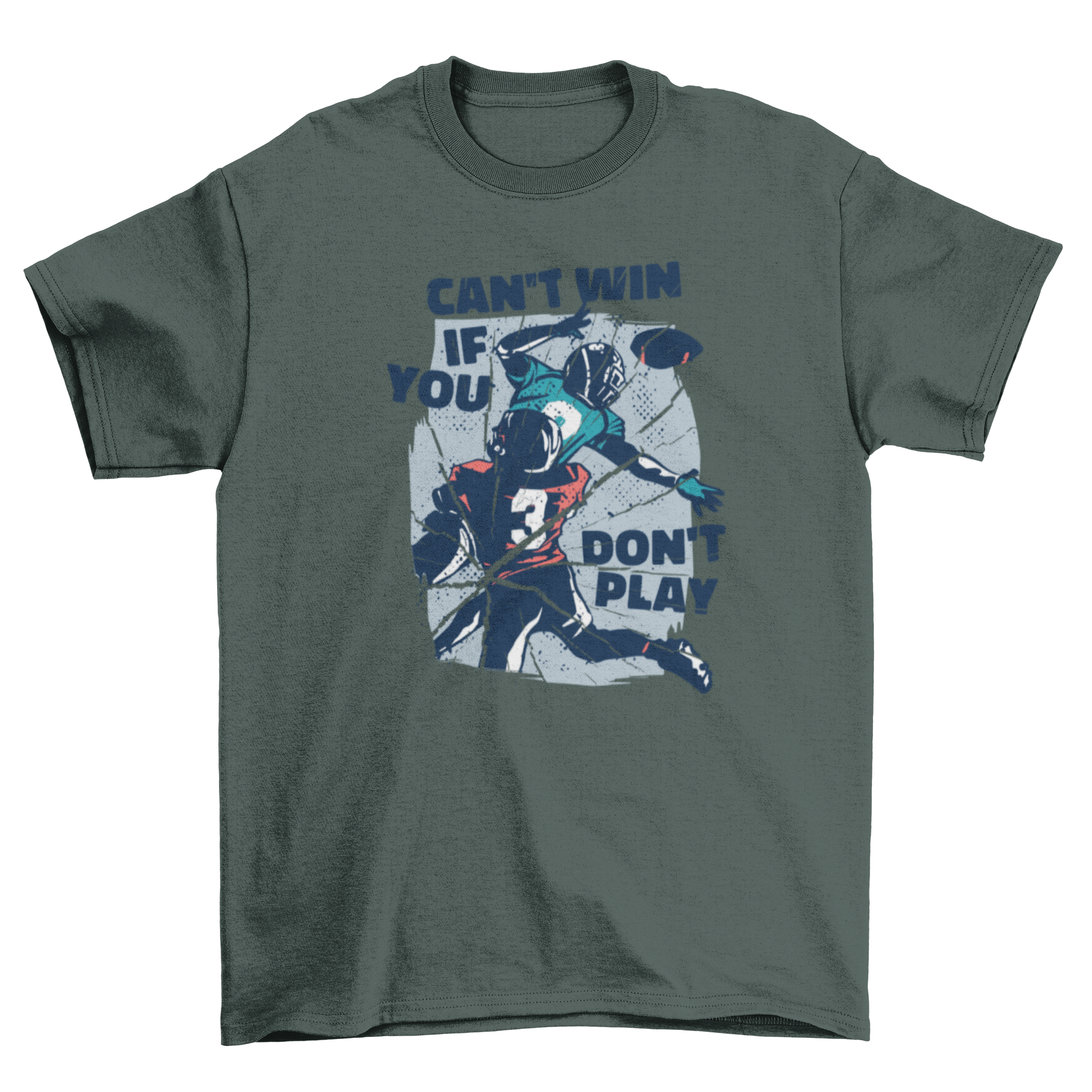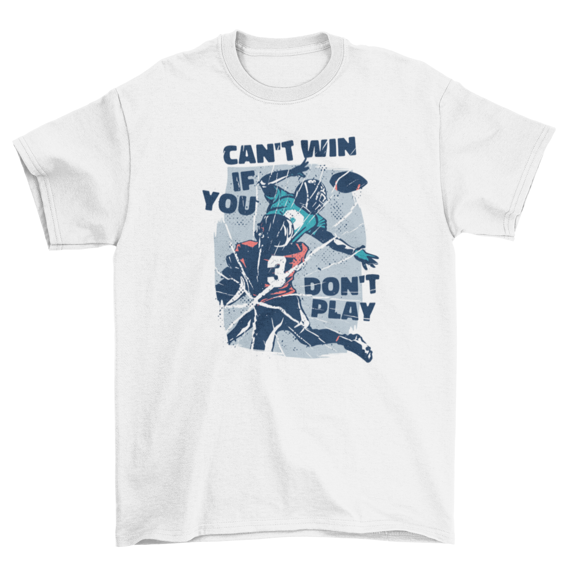 Introducing our American football quote t-shirt, a must-have for any sports enthusiast! This unique t-shirt features a striking design of two American football players in action, accompanied by the inspiring quote, 'Can't win if you don't play.' Whether you're heading to a game, practicing with friends, or just lounging around, this t-shirt is the perfect way to showcase your passion for football.