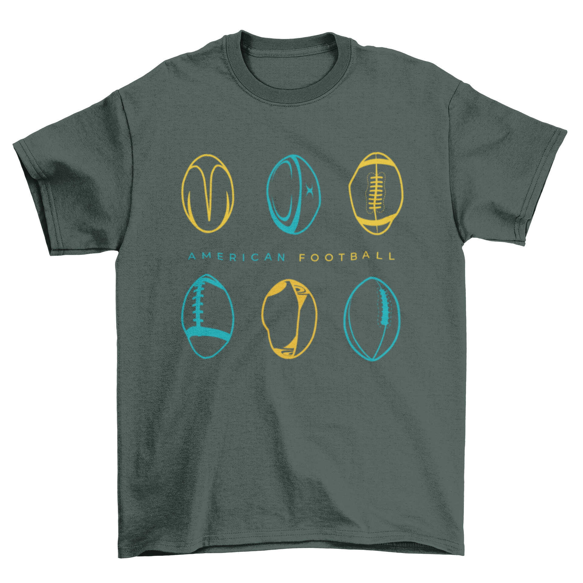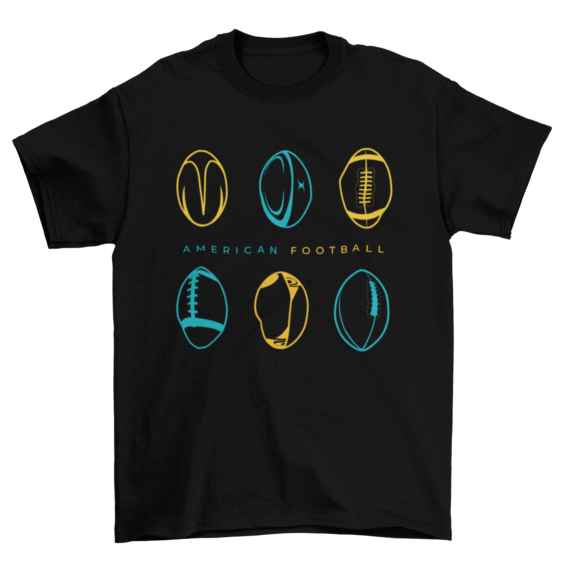 Introducing our stylish American football t-shirt, designed for sports enthusiasts who want to showcase their love for the game. This t-shirt features a unique design that includes six American footballs, each with different designs, beautifully arranged in a vibrant blue and yellow color scheme. The footballs are grouped in pairs of three, with the phrase 'American football' prominently displayed between them, making it a perfect choice for fans of all ages.