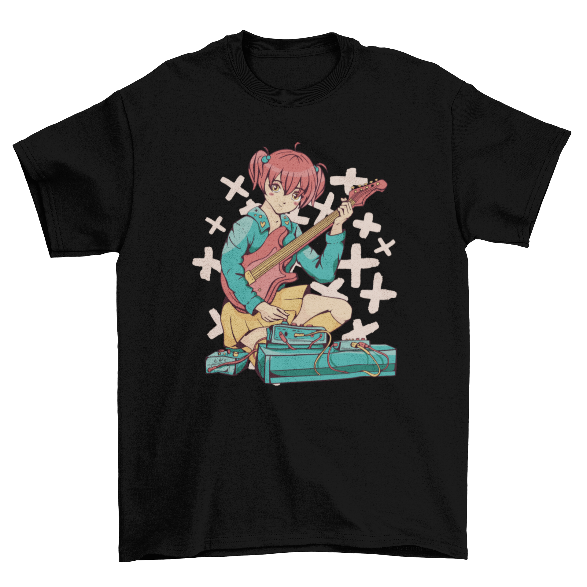 The eye-catching design of the anime girl playing the electric guitar is not only visually appealing but also reflects your unique personality and interests. This t-shirt is perfect for those who want to express their love for anime and music in a fashionable way. Pair it with your favorite jeans or shorts for a casual yet stylish look.