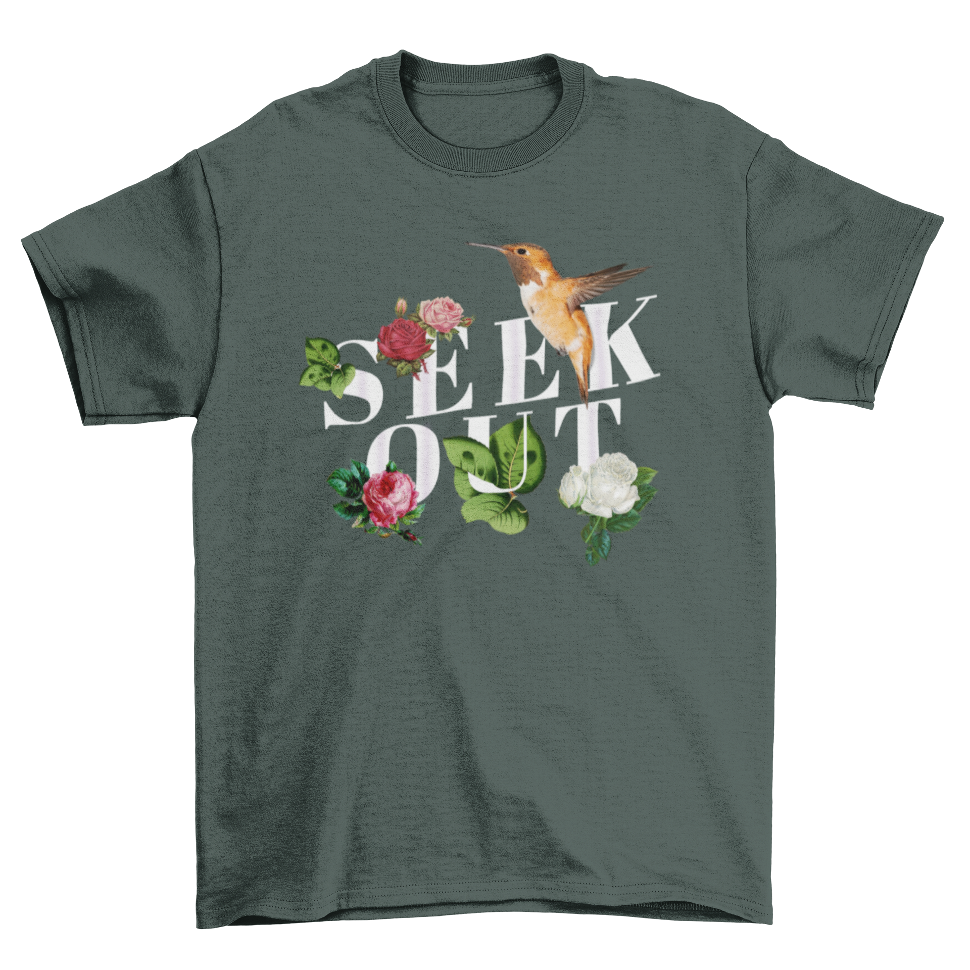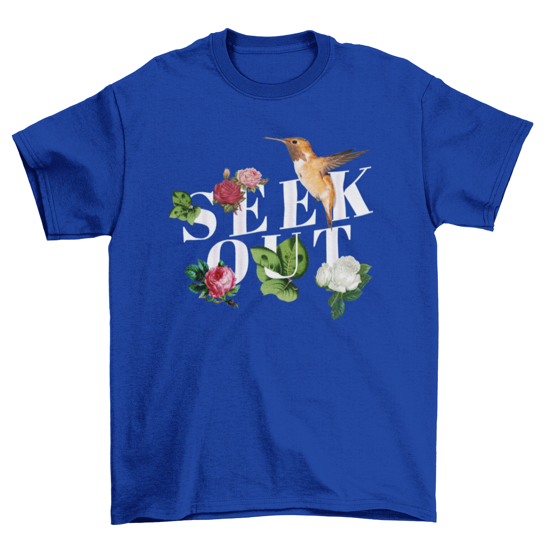 The t-shirt showcases a stunning blend of colors and designs that capture the essence of the great outdoors. The floral elements are beautifully intertwined with bird motifs, creating a harmonious look that is both eye-catching and meaningful. The quote 'Seek out' is prominently displayed, serving as a reminder to pursue your passions and seek out new experiences.