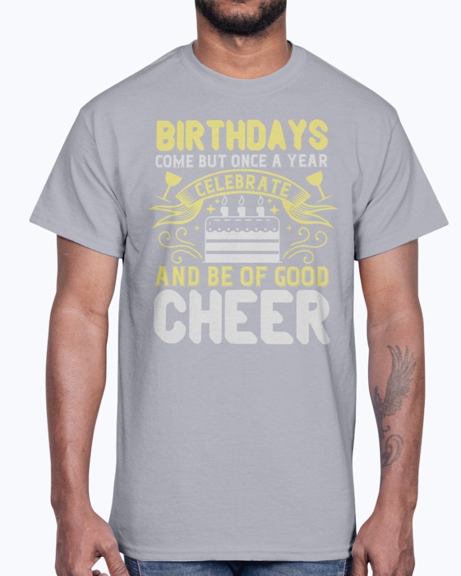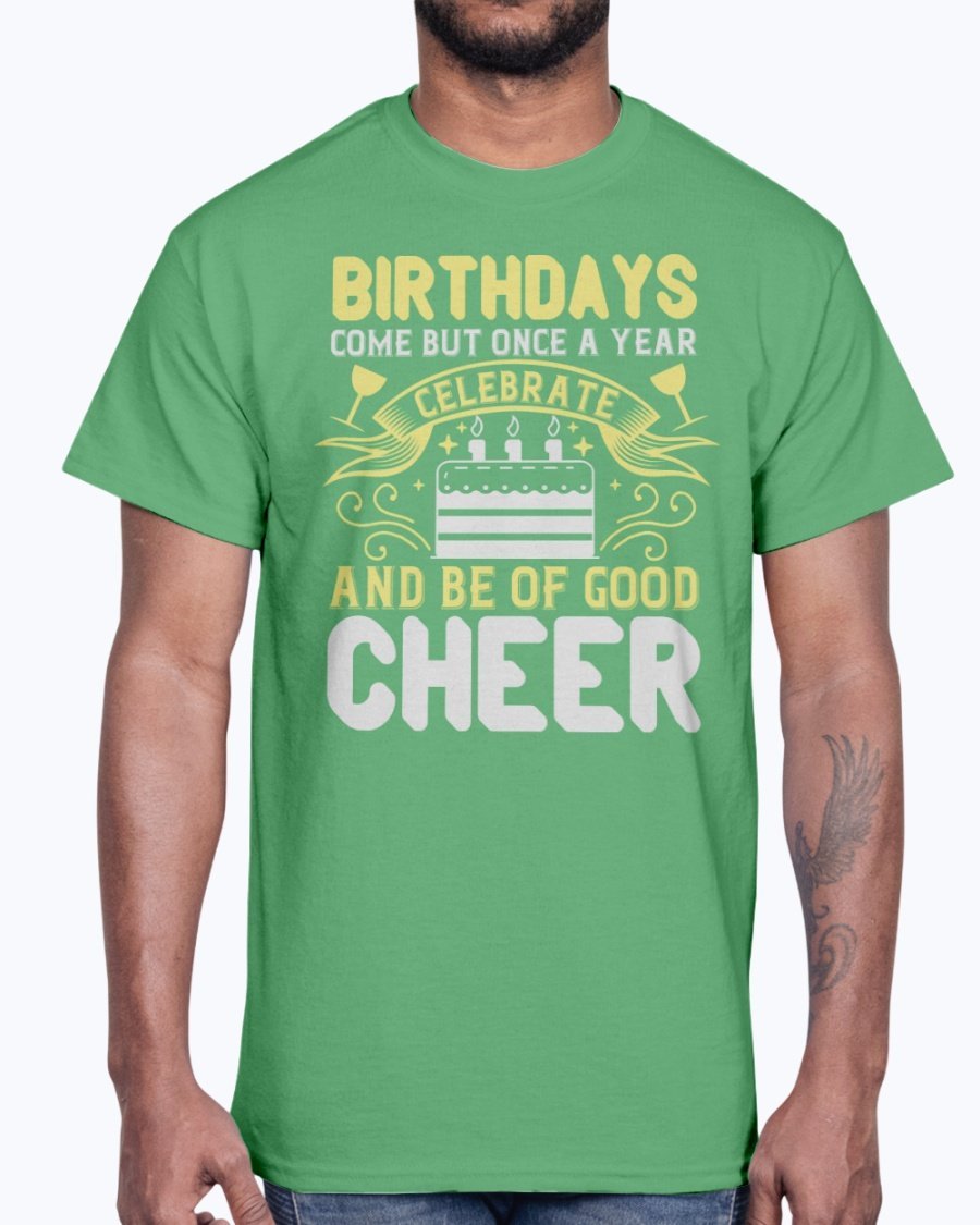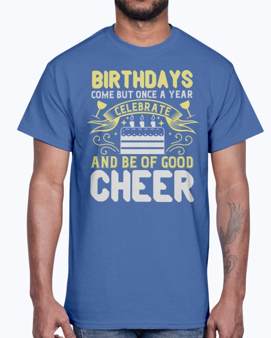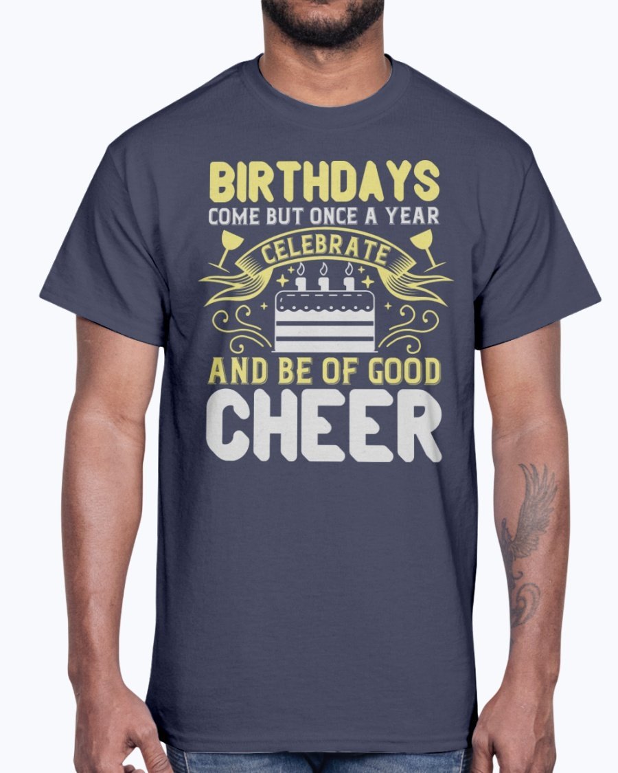 Celebrate the joy of birthdays with our delightful 'Birthdays come but once a year, celebrate and be of good cheer' cotton tee. This shirt is not just a piece of clothing; it's a statement of joy and celebration, perfect for birthday parties, gatherings, or simply to express your love for birthdays. Made from 100% preshrunk cotton, this tee ensures comfort and durability, making it an ideal choice for anyone looking to celebrate their special day in style.