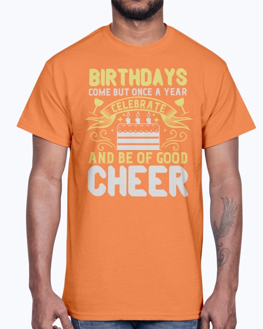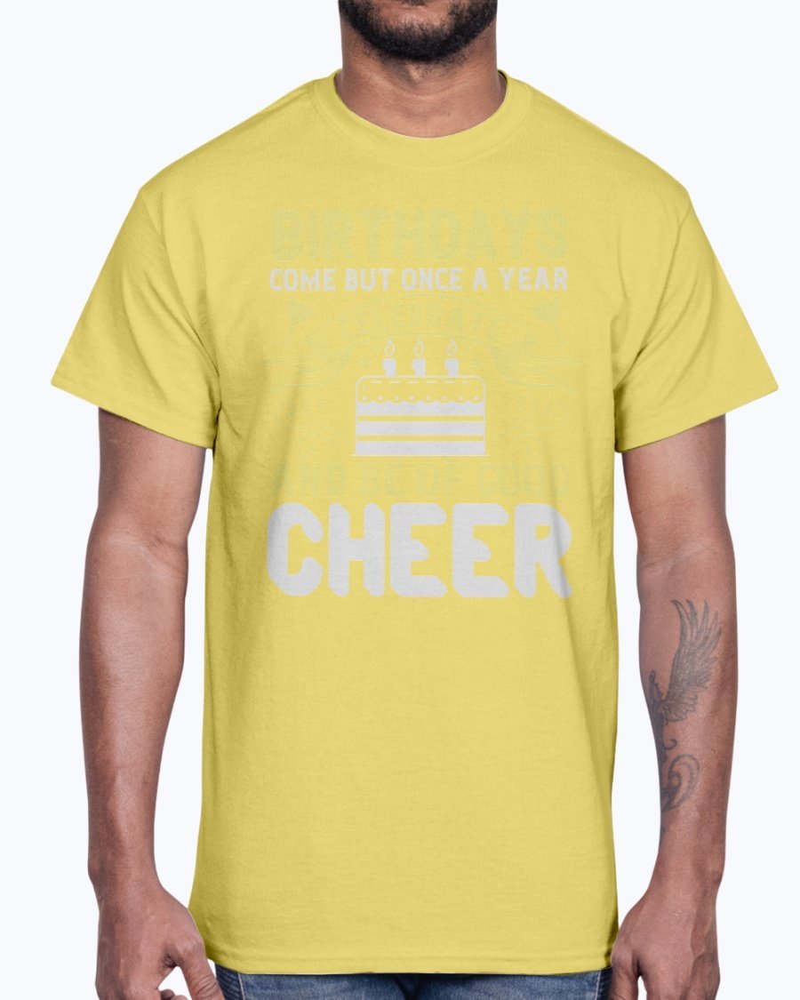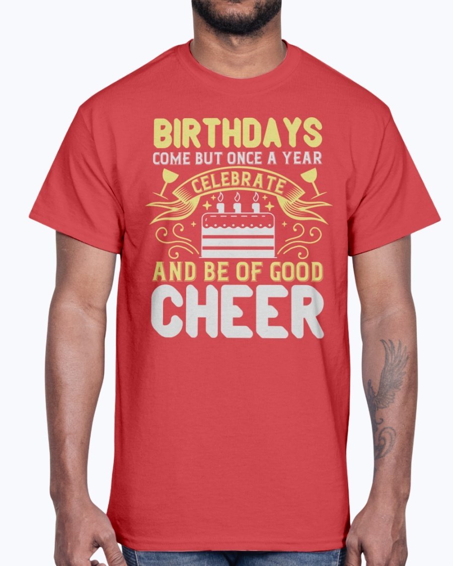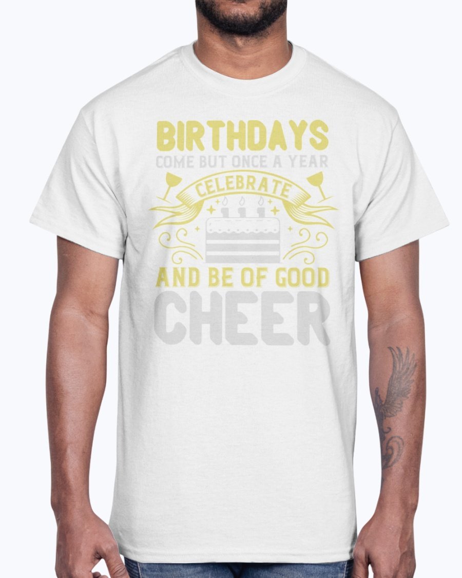 Celebrate the joy of birthdays with our delightful 'Birthdays come but once a year, celebrate and be of good cheer' cotton tee. This shirt is not just a piece of clothing; it's a statement of joy and celebration, perfect for birthday parties, gatherings, or simply to express your love for birthdays. Made from 100% preshrunk cotton, this tee ensures comfort and durability, making it an ideal choice for anyone looking to celebrate their special day in style.