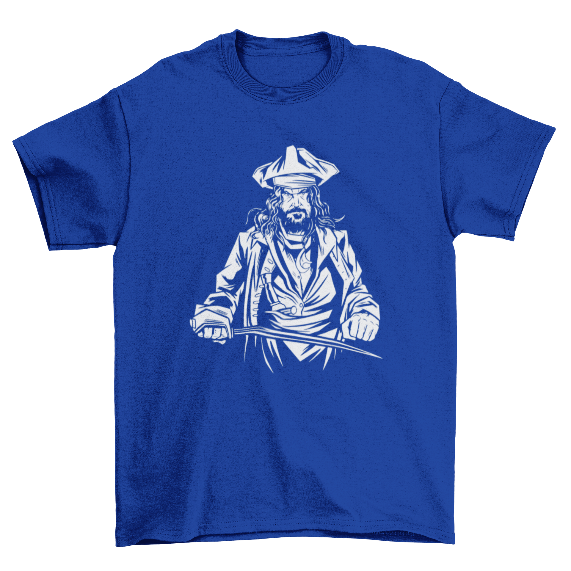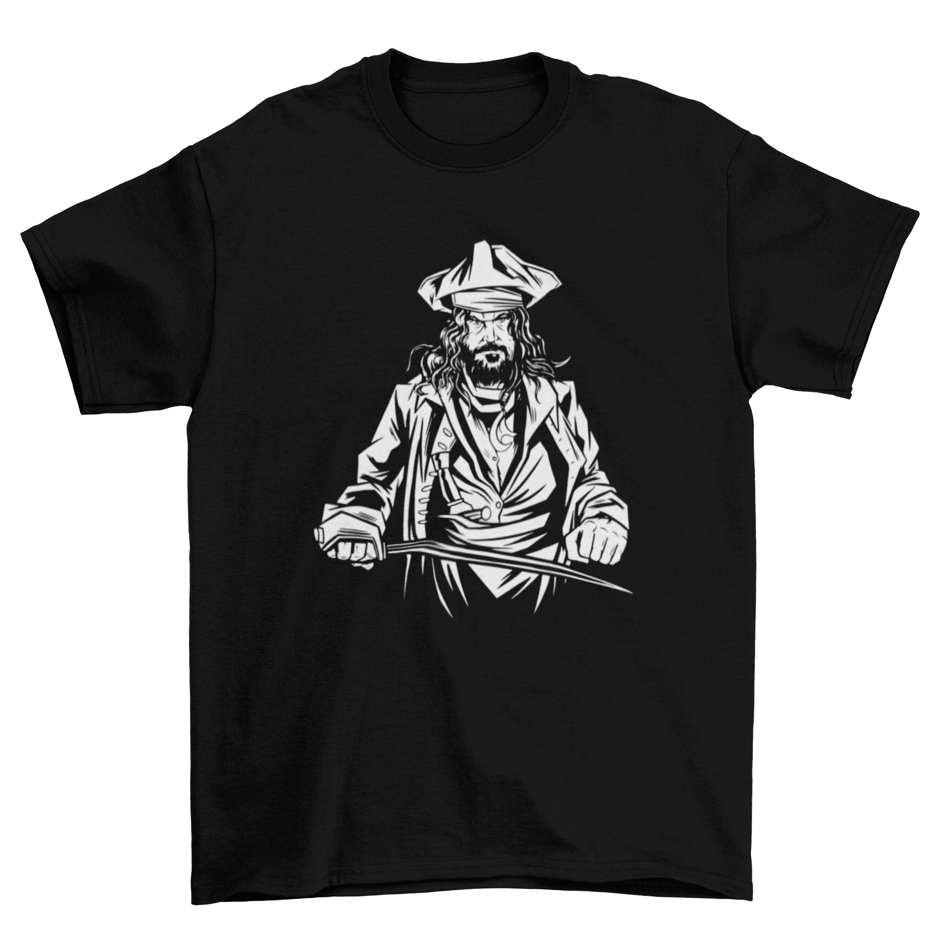 Blackbeard pirate t-shirt featuring a graphic of Blackbeard holding a sword, perfect for pirate enthusiasts.