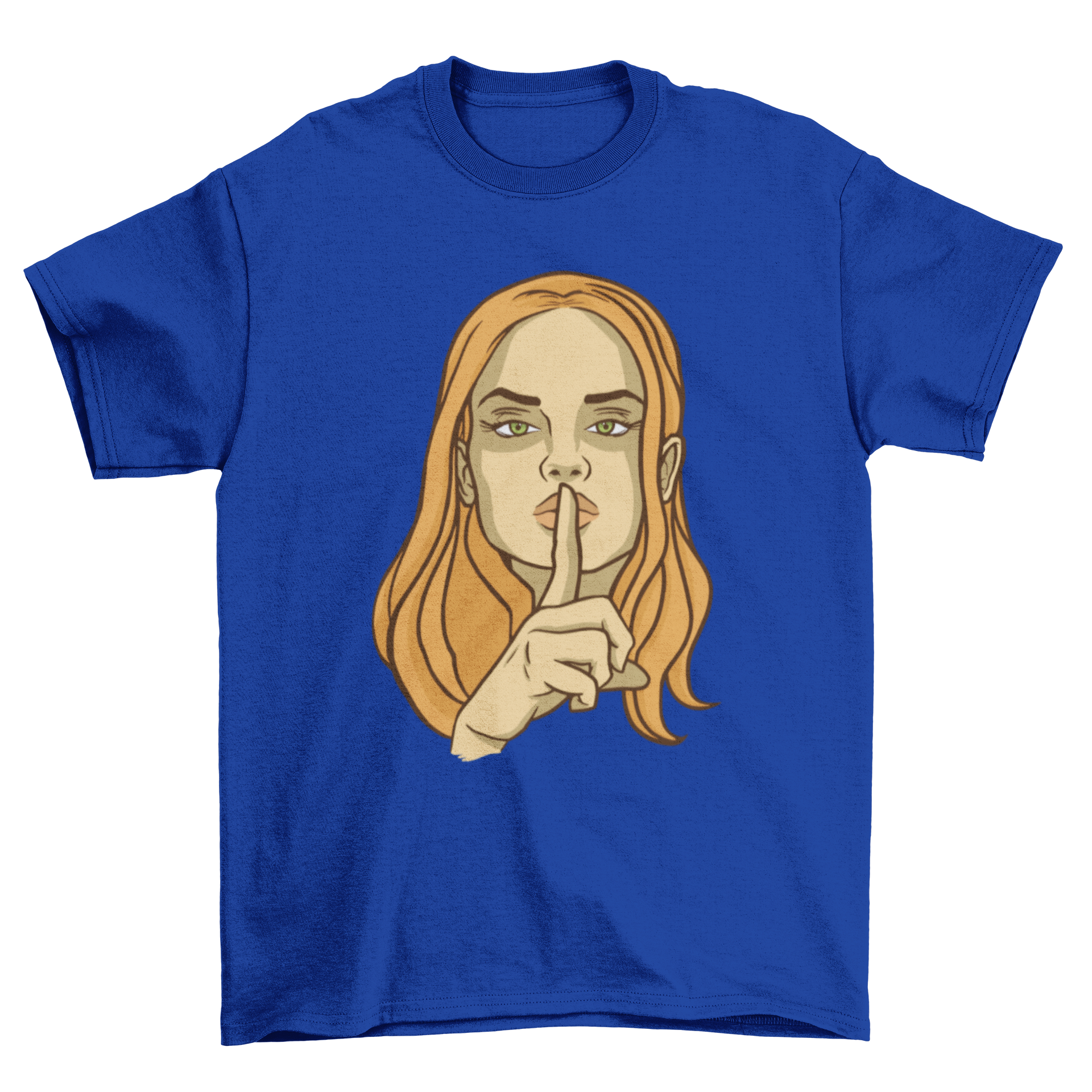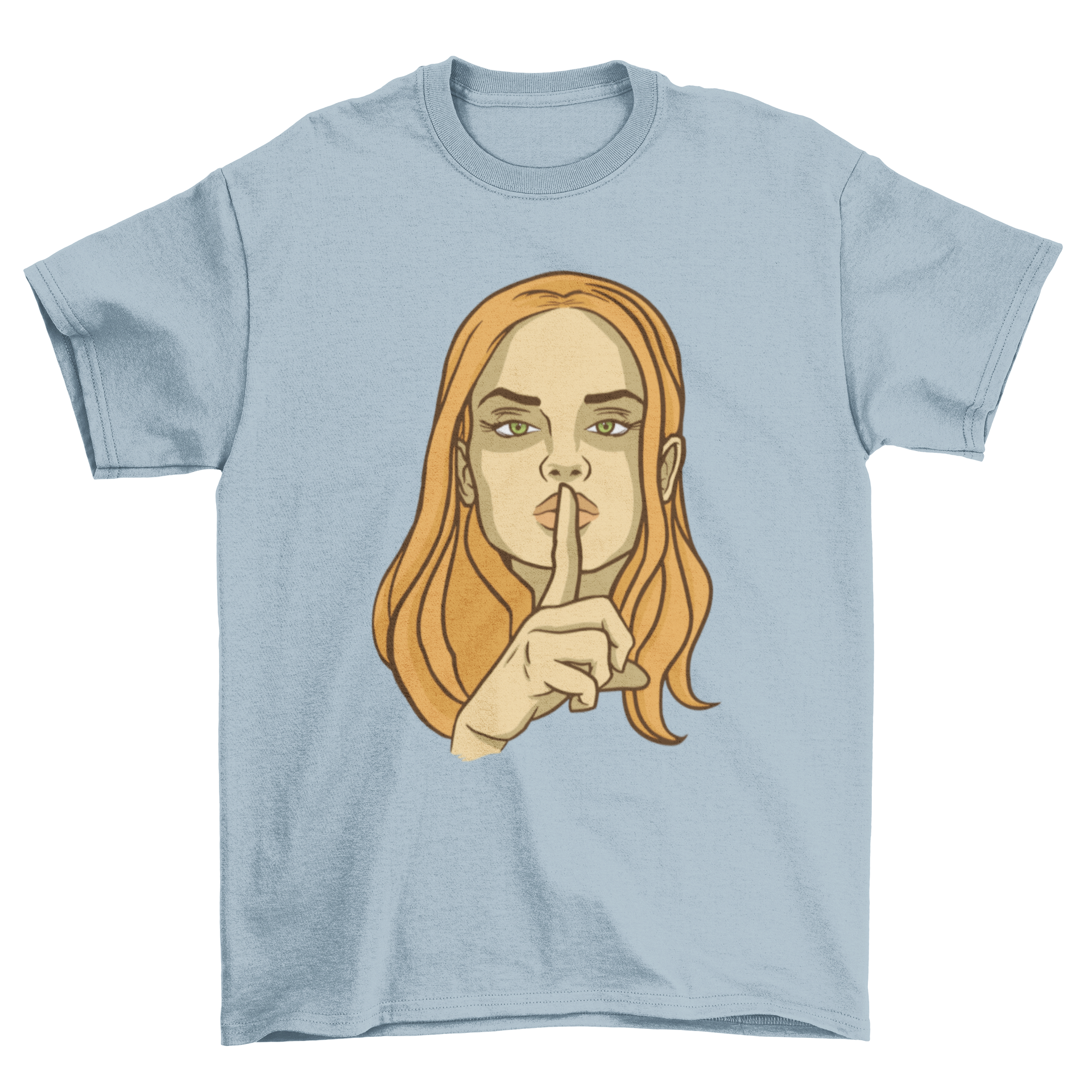 A stylish t-shirt featuring a blonde pale woman in a shushing pose, perfect for casual wear.