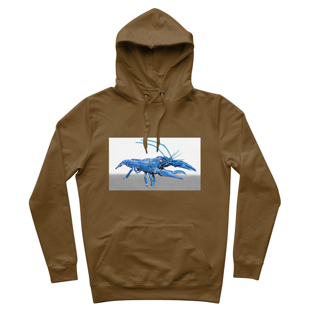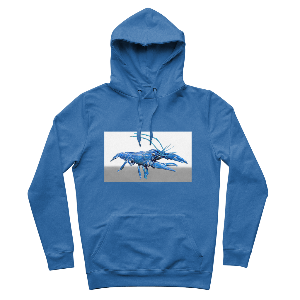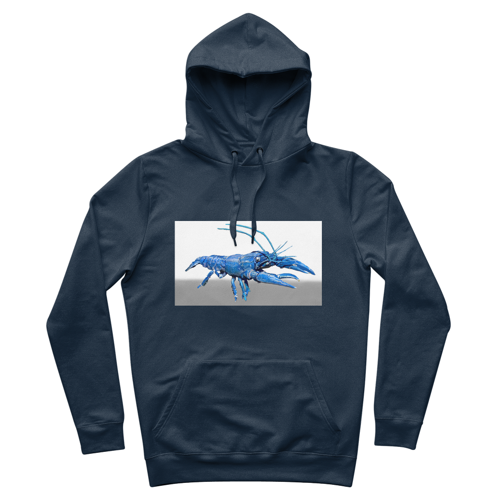 Blue Crawfish Premium Adult Hoodie featuring a lined adjustable hood and kangaroo pocket, made from soft brushed fleece fabric.