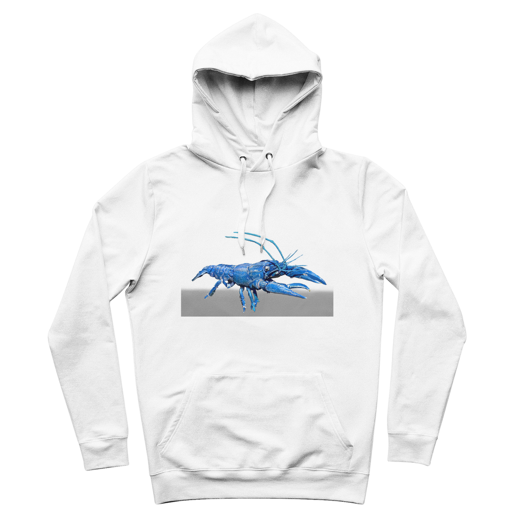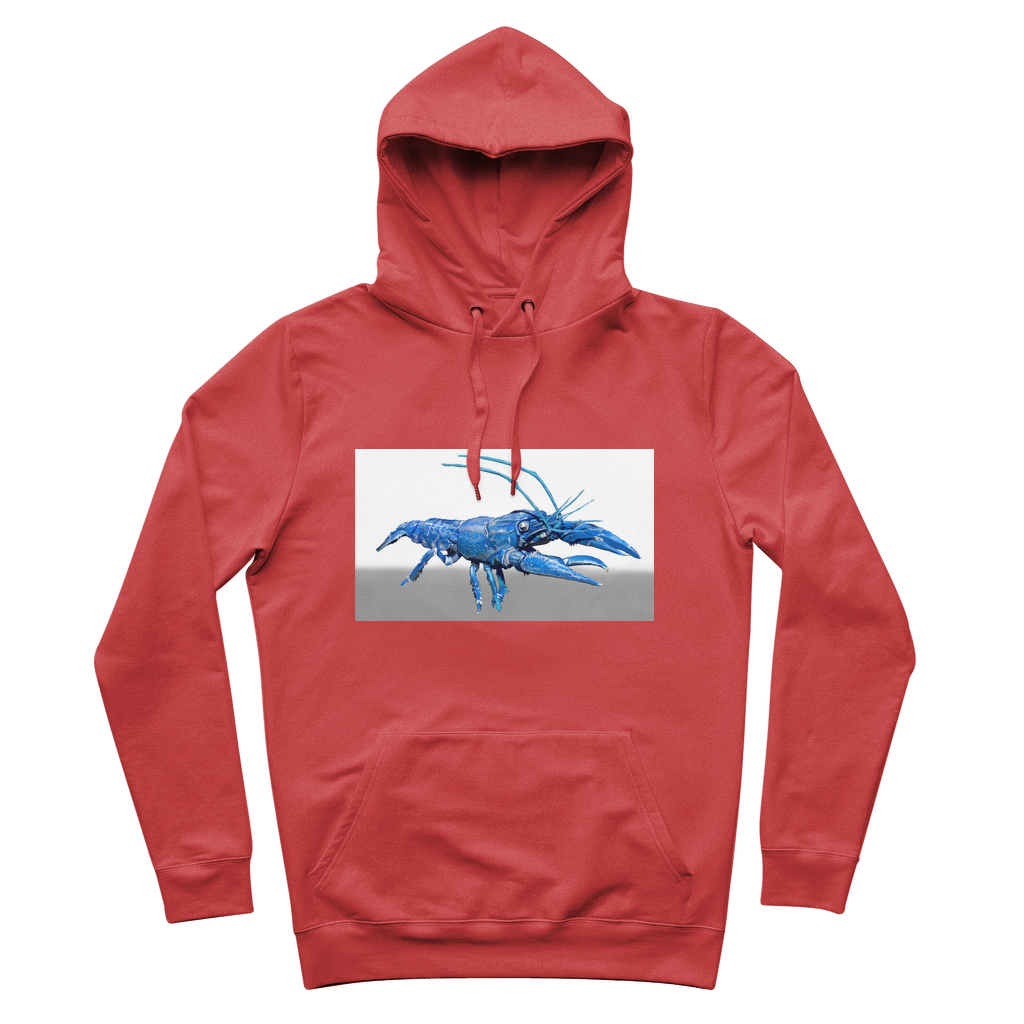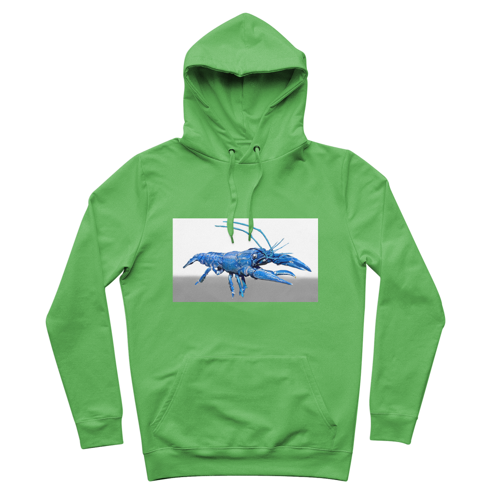 Blue Crawfish Premium Adult Hoodie featuring a lined adjustable hood and kangaroo pocket, made from soft brushed fleece fabric.
