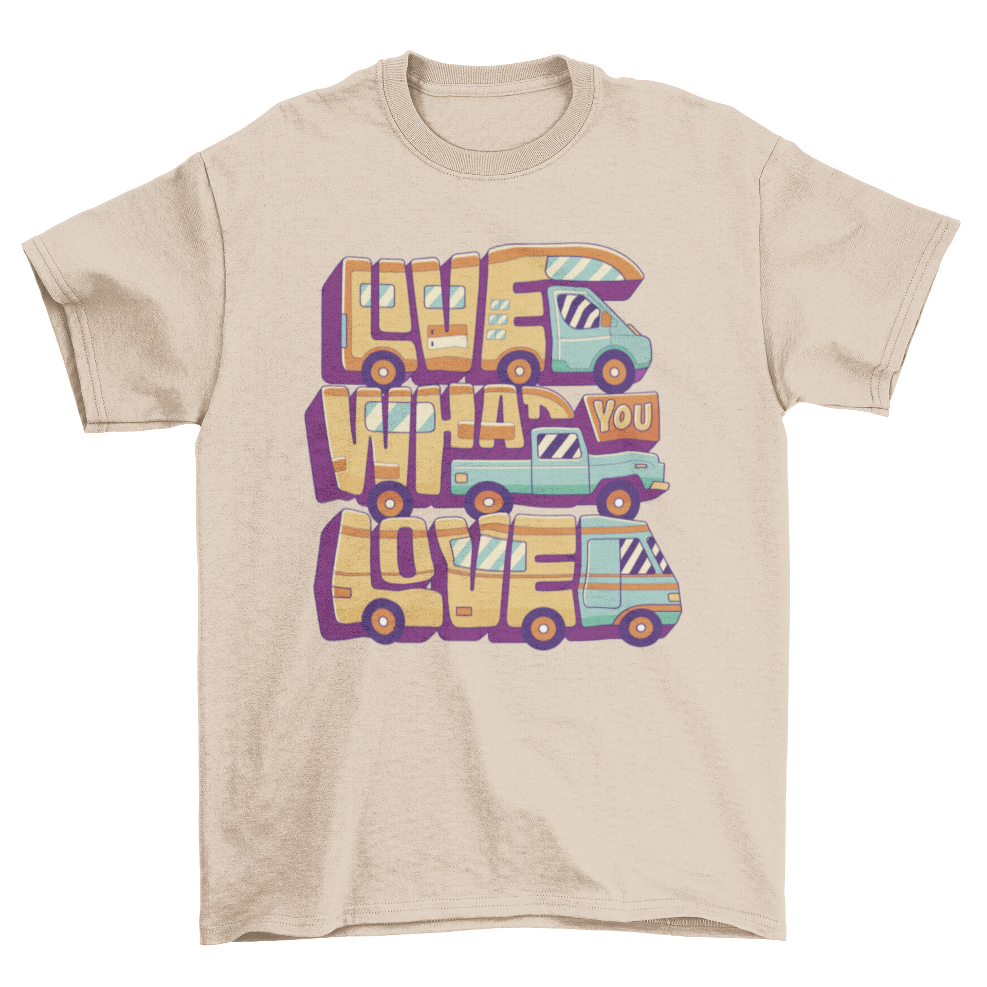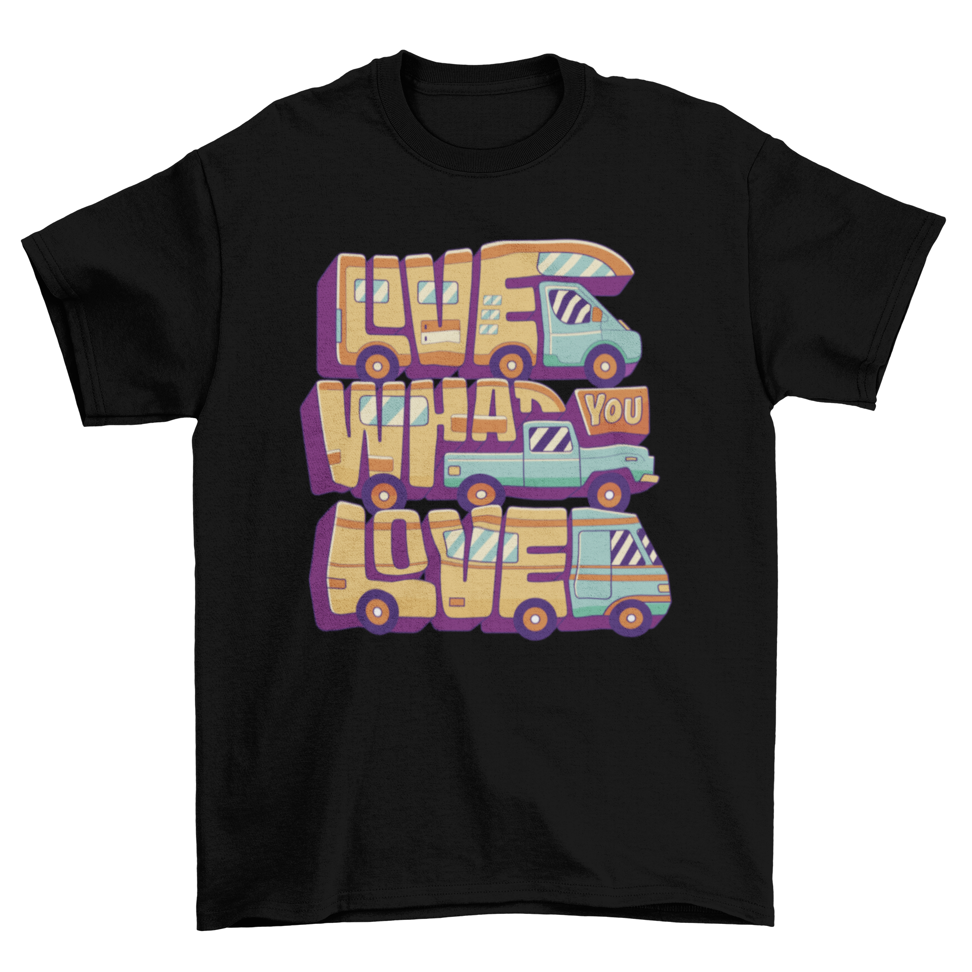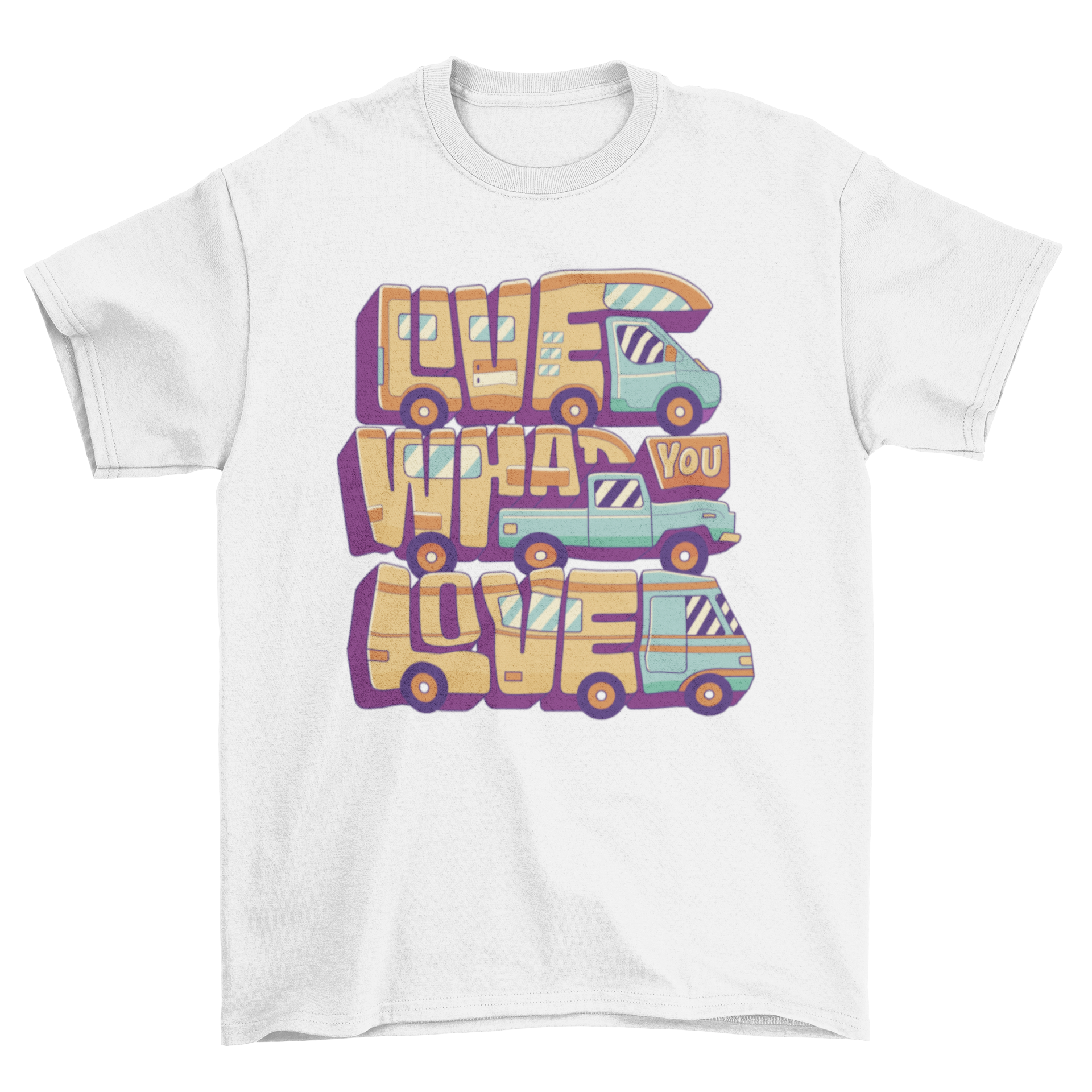 Camping Truck Love Quote T-Shirt featuring RVs and the quote 'Live what you love'.