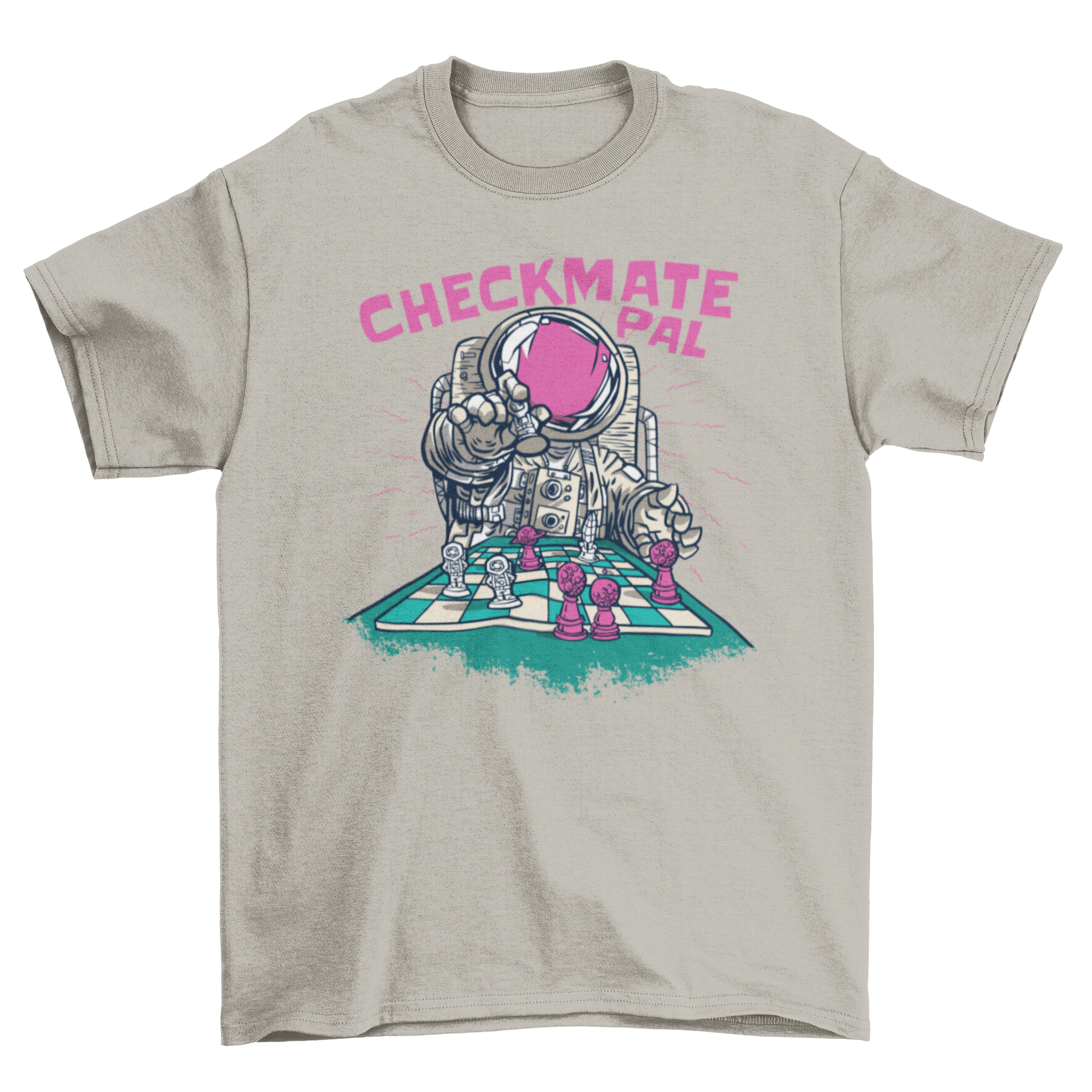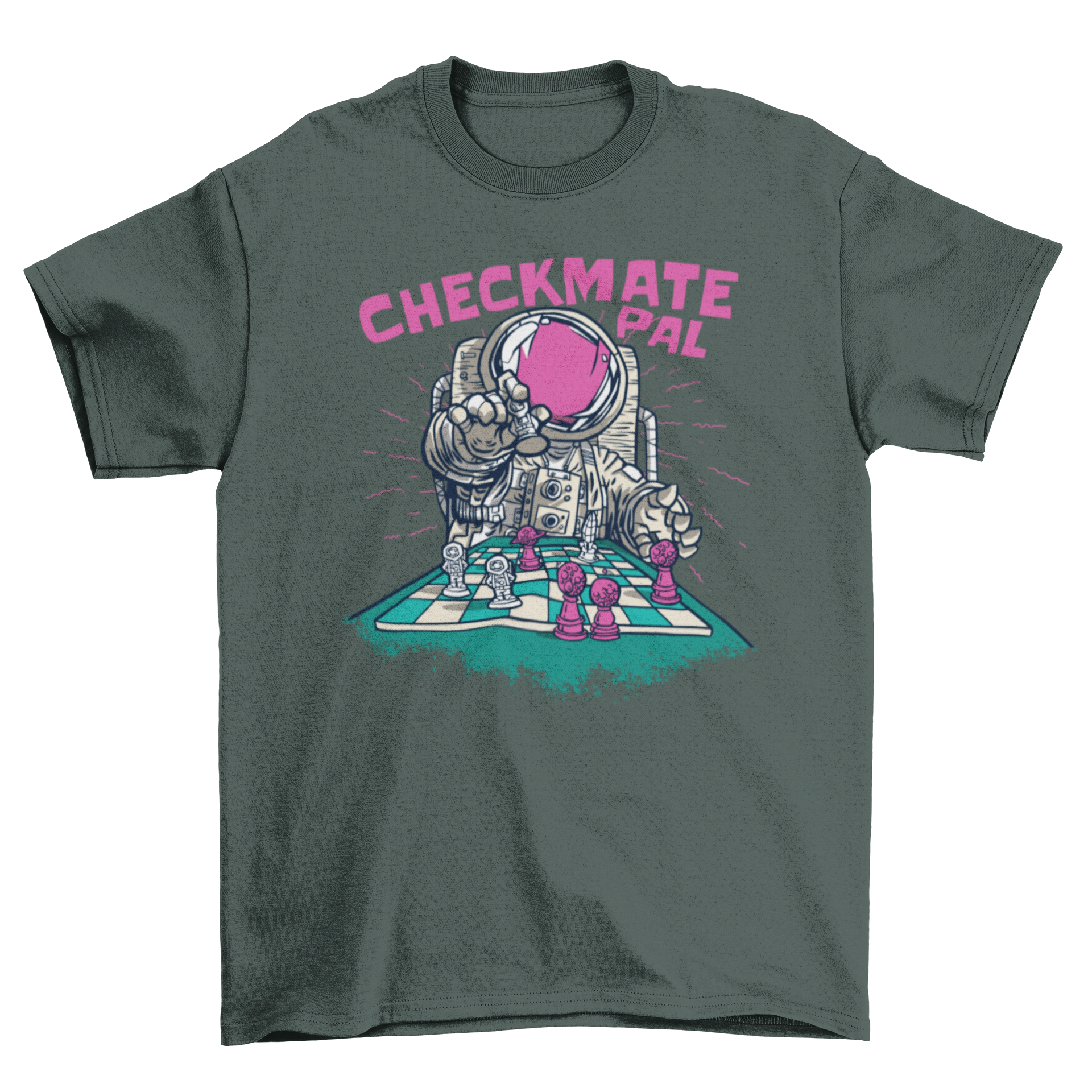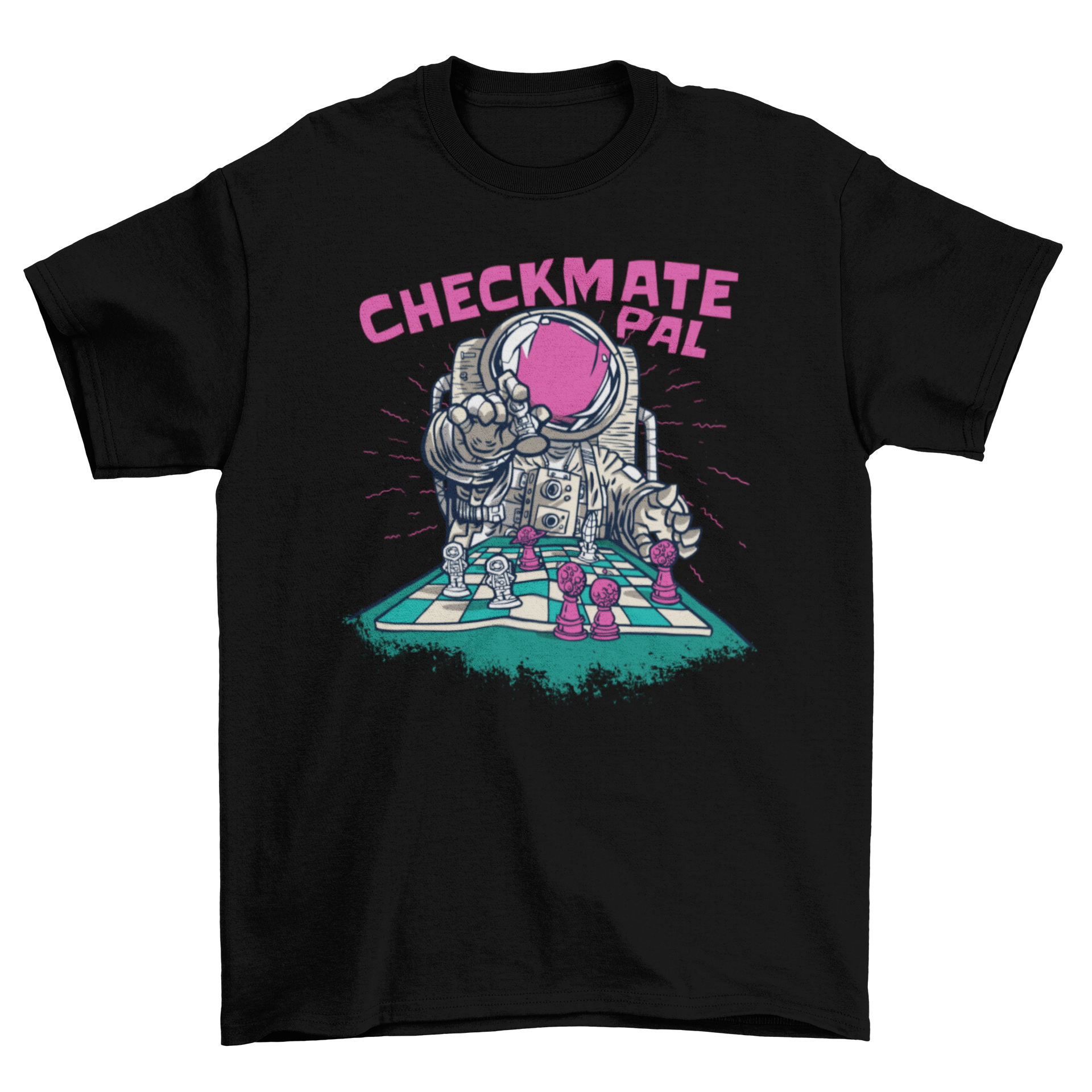 Checkmate astronaut chess t-shirt featuring an astronaut playing chess with the quote 'Checkmate pal' in vibrant illustration style.