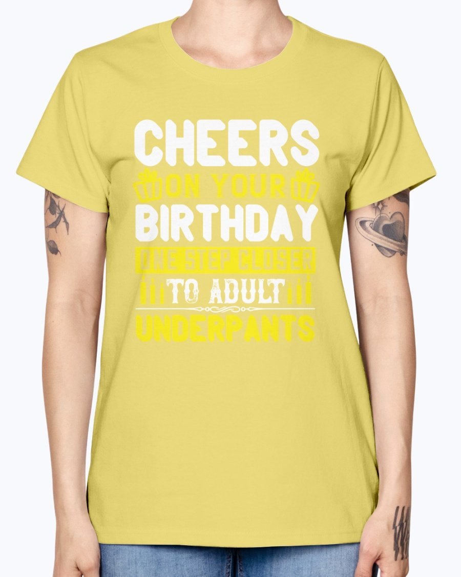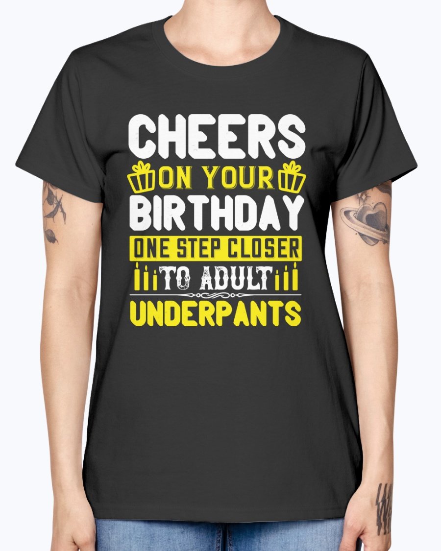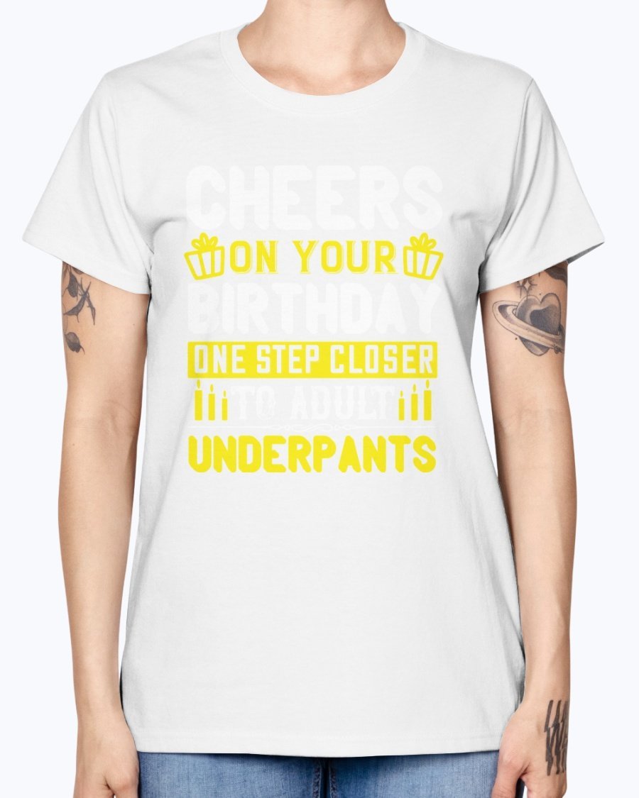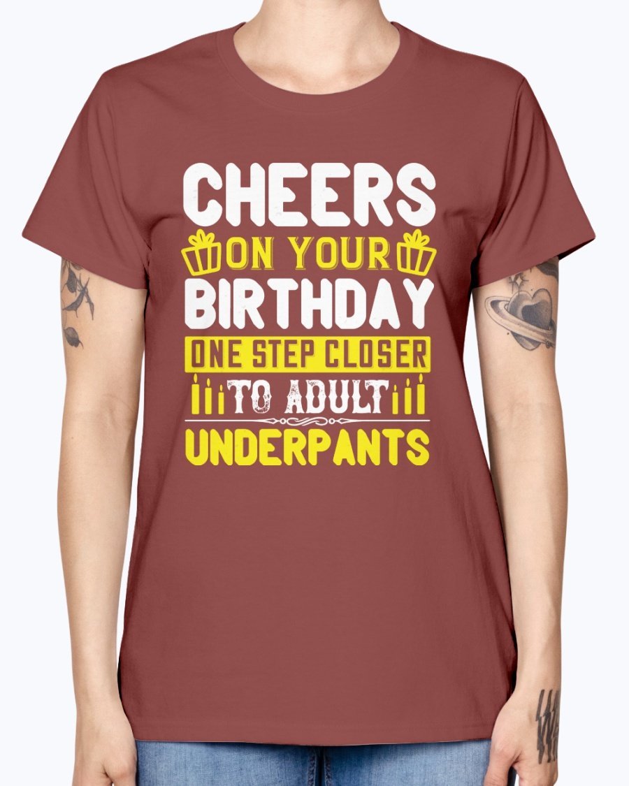 Celebrate your special day with our unique 'Cheers on your birthday. One step closer to adult underpants' Missy T-Shirt. This fun and stylish t-shirt is designed to bring a smile to your face as you embrace another year of life. Made from 100% preshrunk cotton, this shirt is not only comfortable but also durable, ensuring it will be a staple in your wardrobe for years to come.