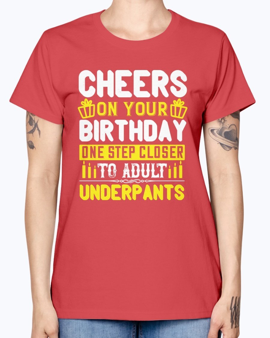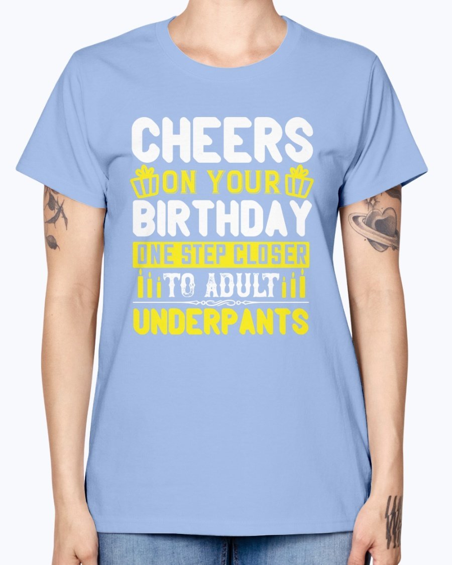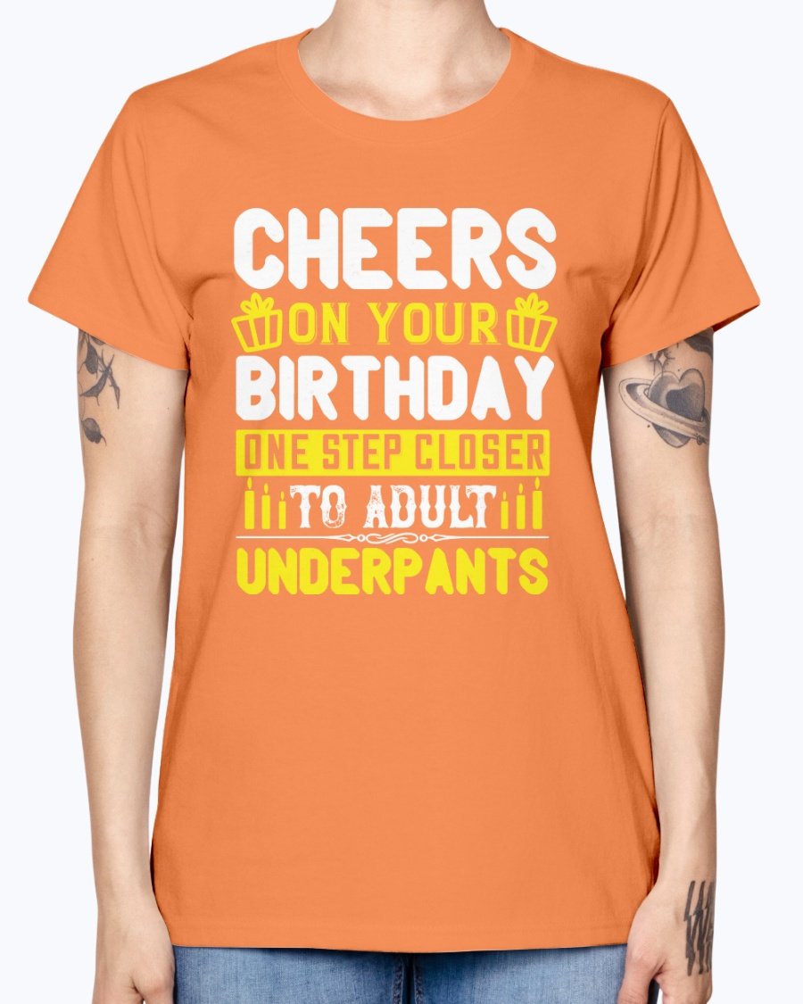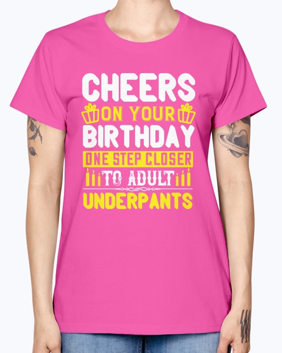 Celebrate your special day with our unique 'Cheers on your birthday. One step closer to adult underpants' Missy T-Shirt. This fun and stylish t-shirt is designed to bring a smile to your face as you embrace another year of life. Made from 100% preshrunk cotton, this shirt is not only comfortable but also durable, ensuring it will be a staple in your wardrobe for years to come.